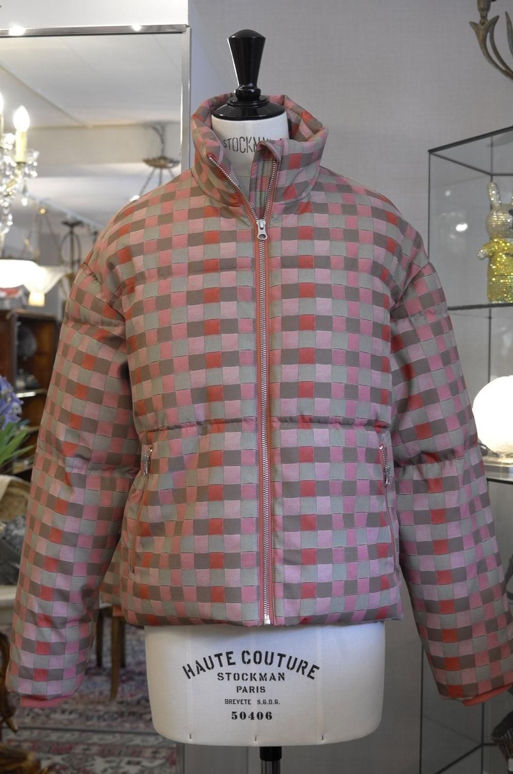 【フランス新品ファッションレディース】ダウンジャケットアウターコート チェック柄 はんなりしたサーモンピンク緑グリーン モード パリ