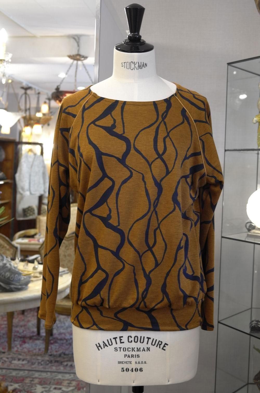 【フランス新品ファッションレディース】長袖カットソートップス ラグラン袖パイピング モダン柄 紺茶 フレンチデザイナー パリ