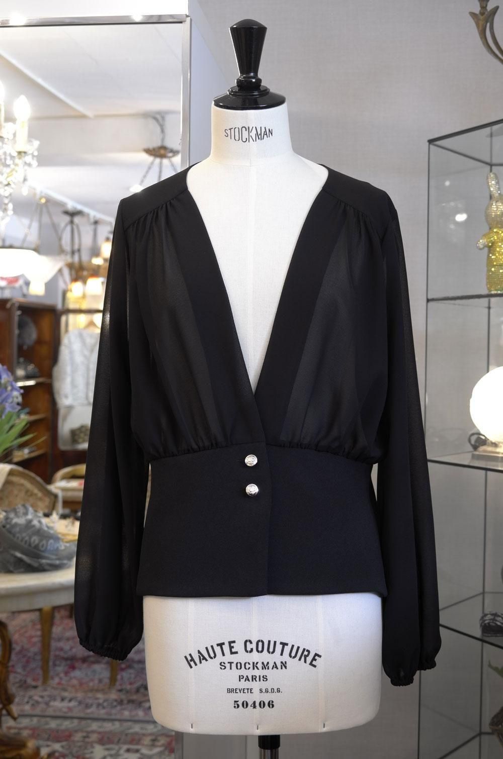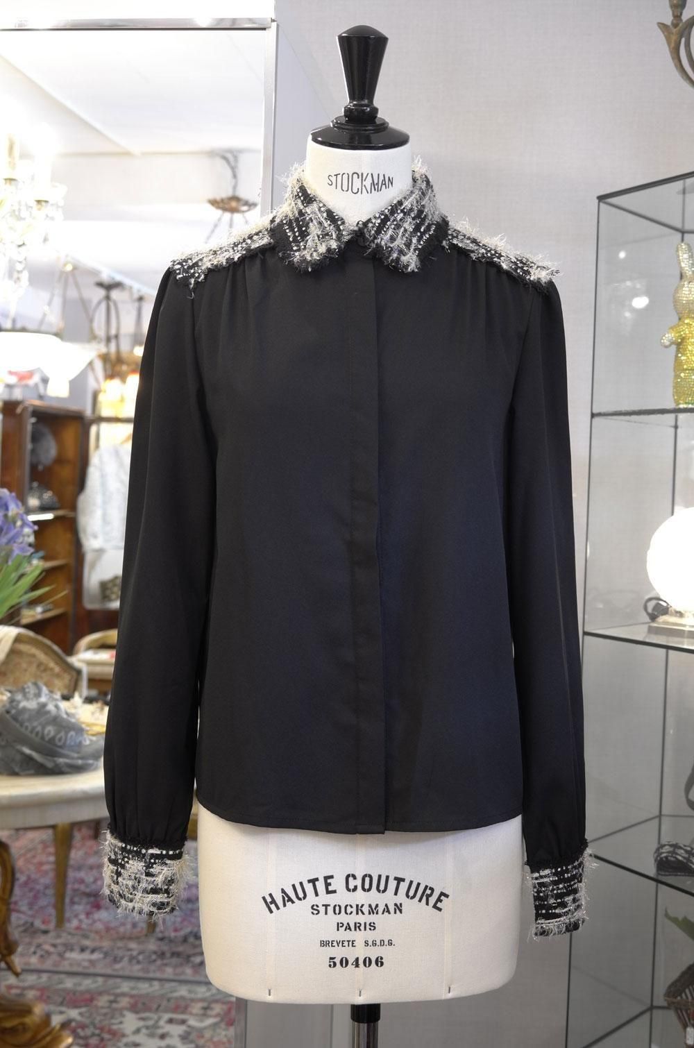 【フランス新品ファッションレディース】長袖ブラウスシャツトップス もけもけ襟肩デザイン 前隠しボタン 黒白 モダン パリ