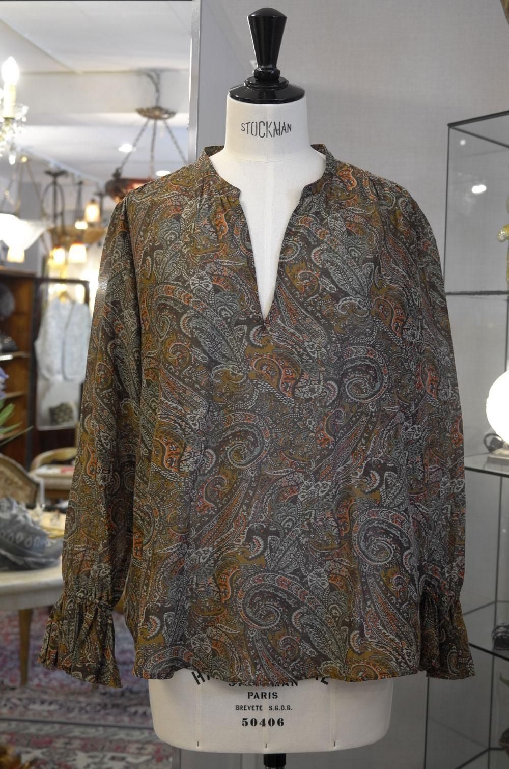 【フランス新品ファッションレディース】長袖ブラウスシャツトップス スリットネック 薄手 ペイズリー柄 茶オレンジ緑 モダン パリ