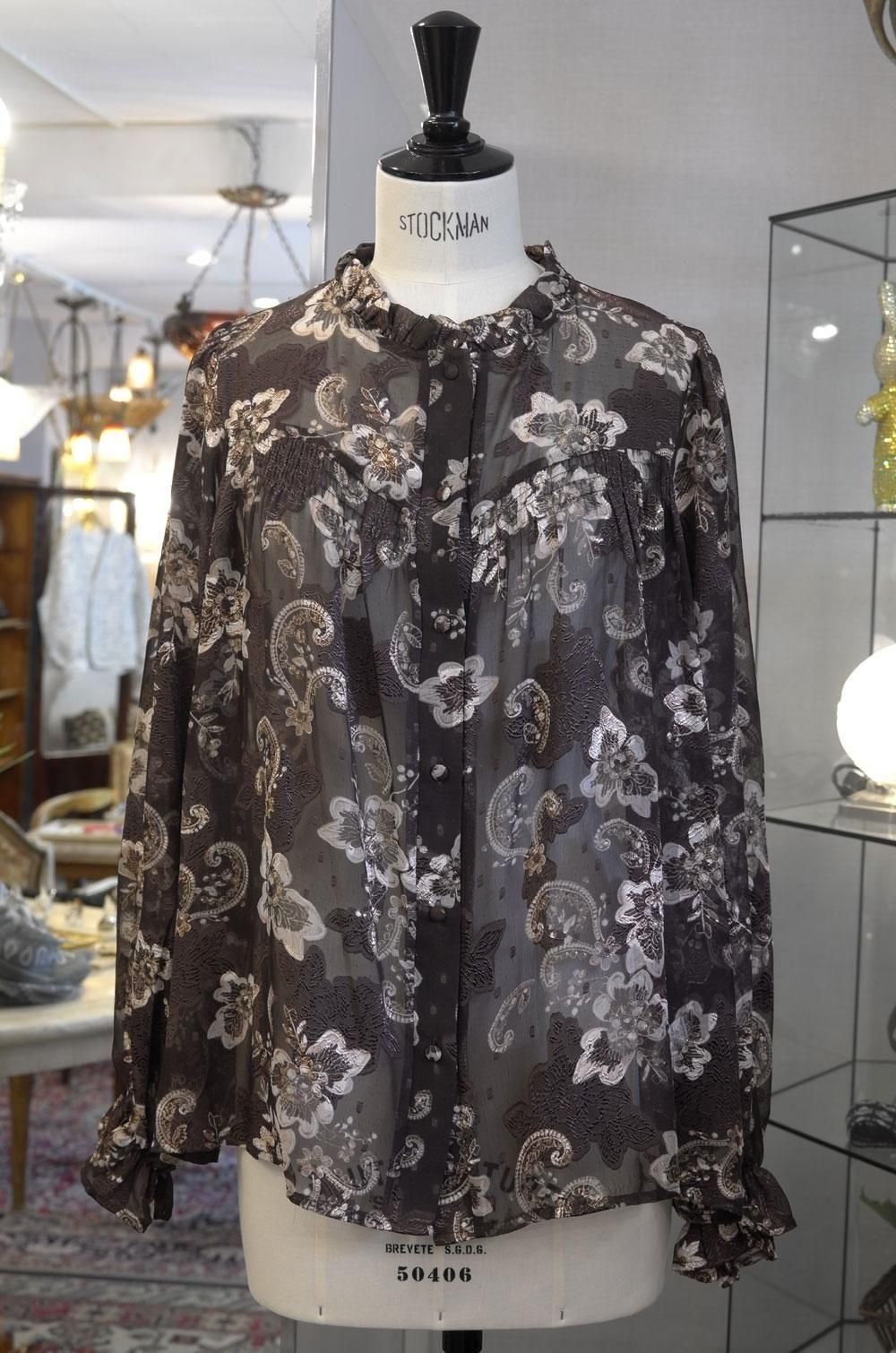 【フランス新品ファッションレディース】長袖ブラウスシャツトップス フリル襟 薄手 ペイズリー花フラワー柄 茶 金刺繍 モダン パリ