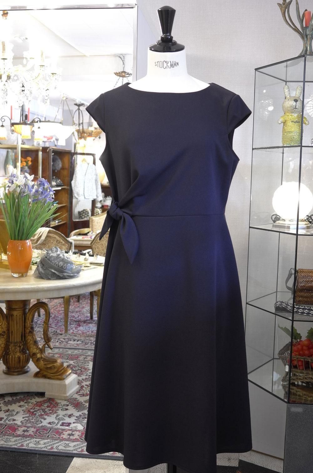 【フランス新品ファッションレディース】半袖ワンピース オブロングネック ウエストリボン フレンチスリーブ 上質紺 モダン パリ