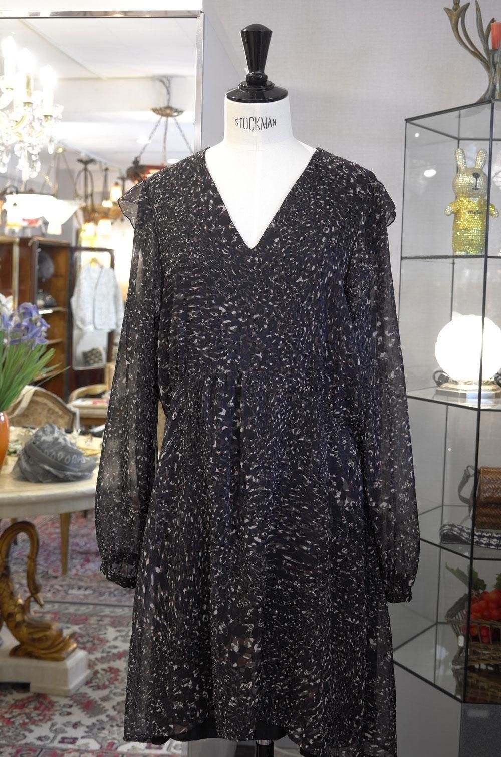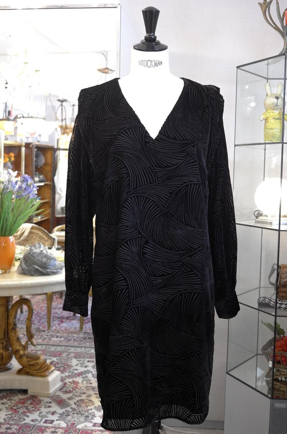 【フランス新品ファッションレディース】長袖ワンピースチュニック Vネック 幾何学葉リーフ模様 黒ベルベット モード パリ