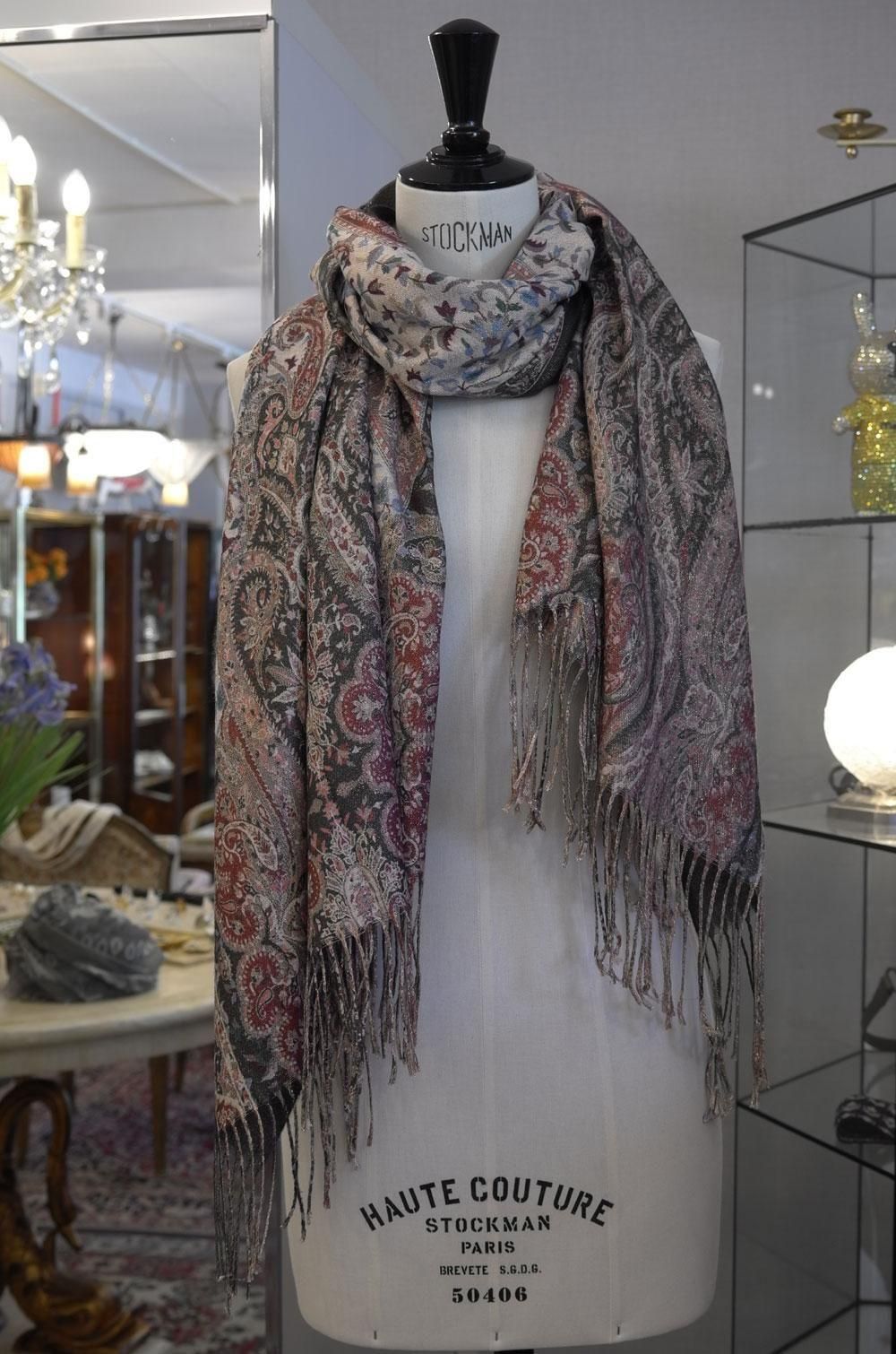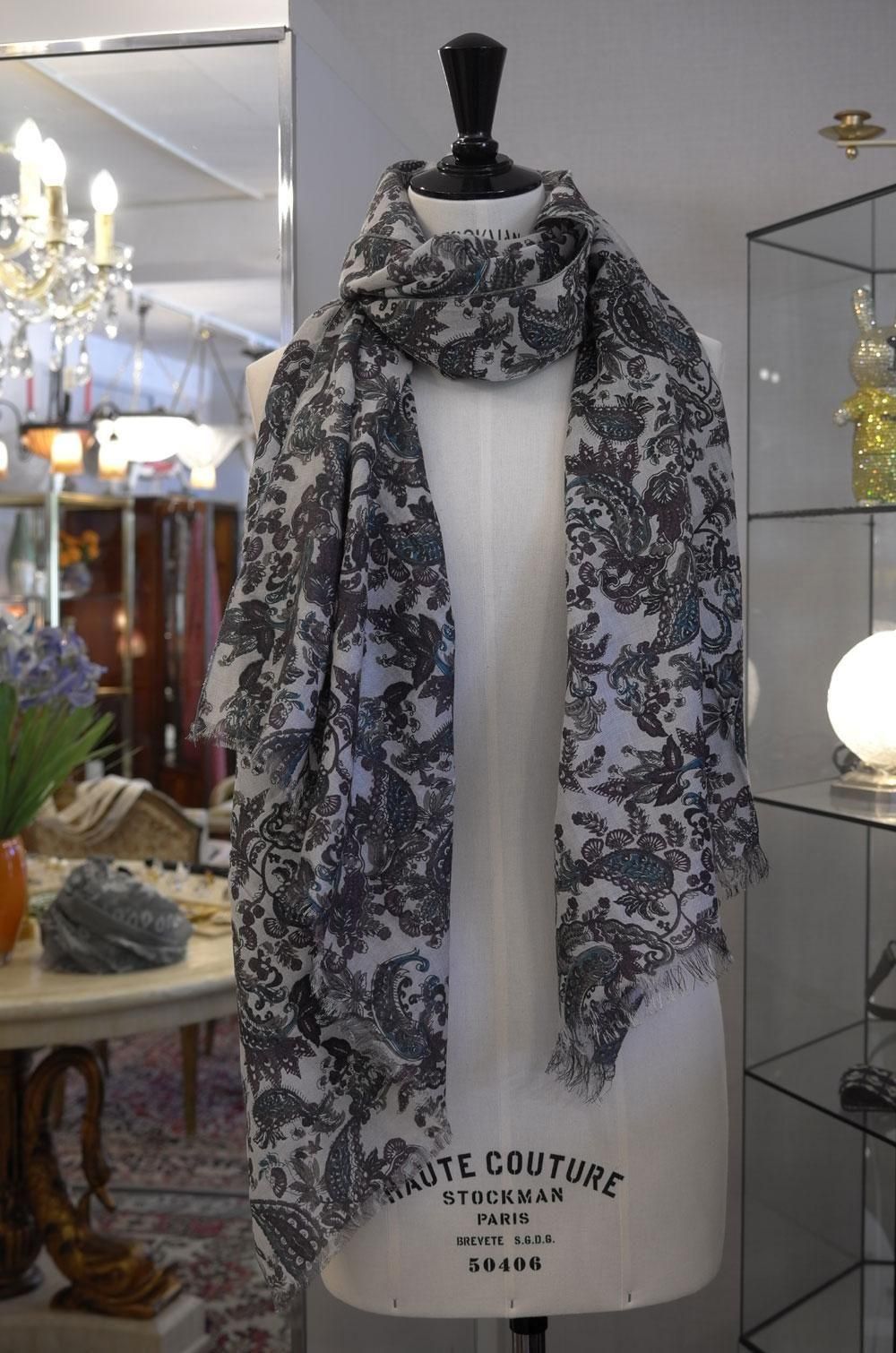 【フランス新品ファッション雑貨レディース】マフラー ストール ペイズリー柄 ベージュ緑茶 カシミヤ混 モダン パリ