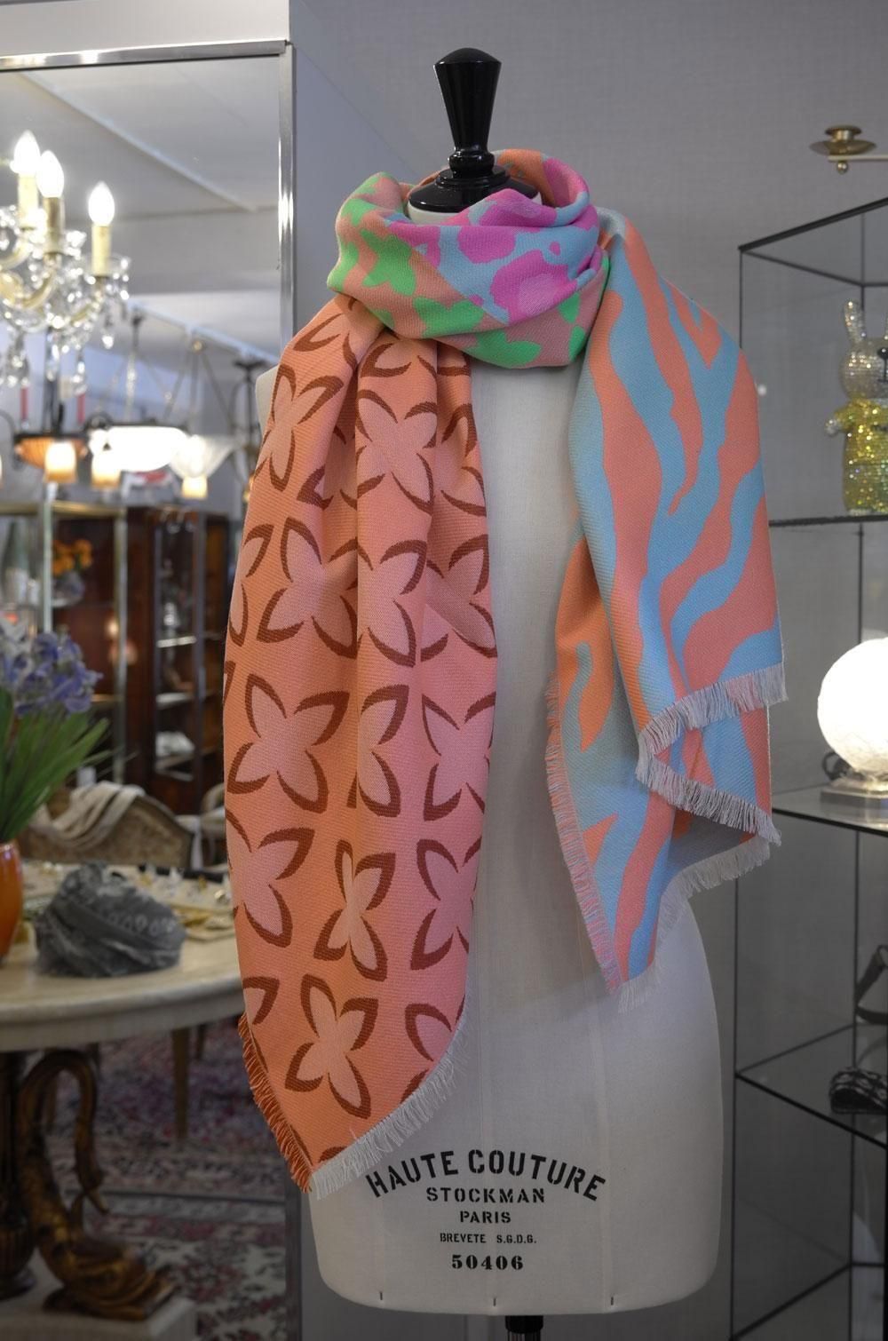 【フランス新品ファッション雑貨レディース】マフラー ストール フリンジ ゼブラ豹モノグラムミックス模様 厚手オレンジ水色緑 モダン パリ