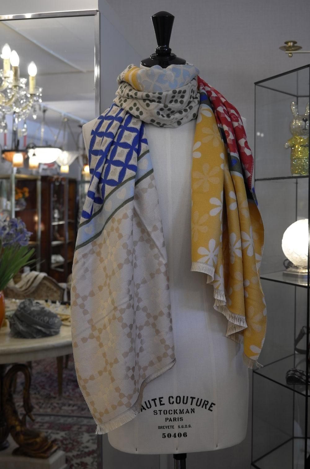 【フランス新品ファッション雑貨レディース】マフラー ストール フリンジ ハート花モノグラムミックス模様 厚手ベージュ青赤緑黄 モダン パリ