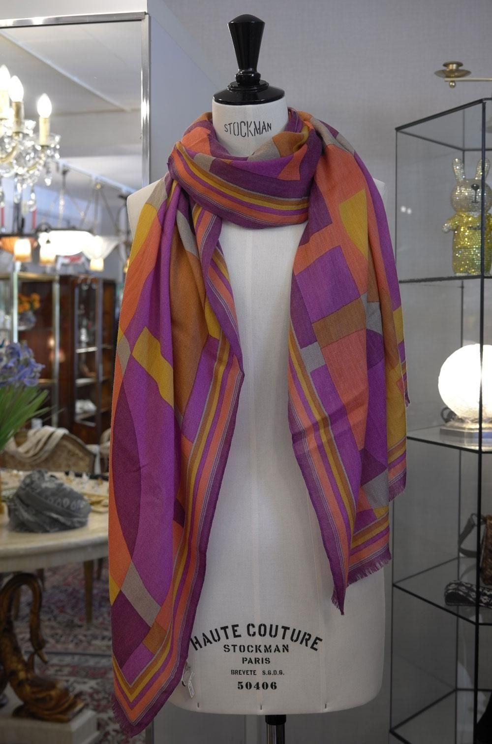 【フランス新品ファッション雑貨レディース】マフラー ストール 幾何学柄 中厚やわらか 紫オレンジ黄 モダン パリ