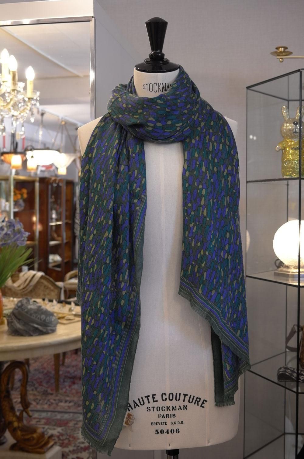 【フランス新品ファッション雑貨レディース】マフラー ストール 有機柄 中厚やわらか 紺緑ベージュ モダン パリ