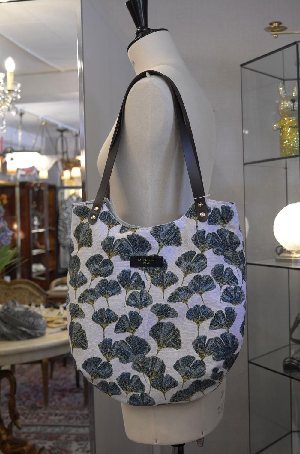 【フランス新品ファッション雑貨レディース】トートバック ショルダー イチョウ銀杏柄 白青金織り 革持ち手 フレンチデザイナー パリ