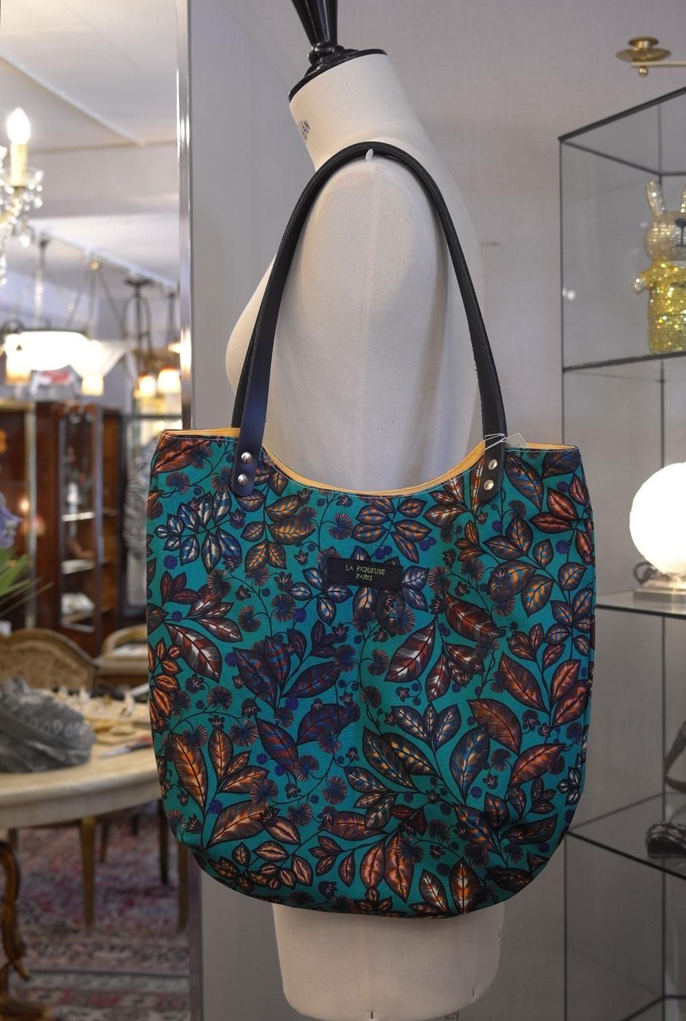 【フランス新品ファッション雑貨レディース】トートバック ショルダー 植物花葉柄 緑オレンジ 革持ち手 フレンチデザイナー パリ