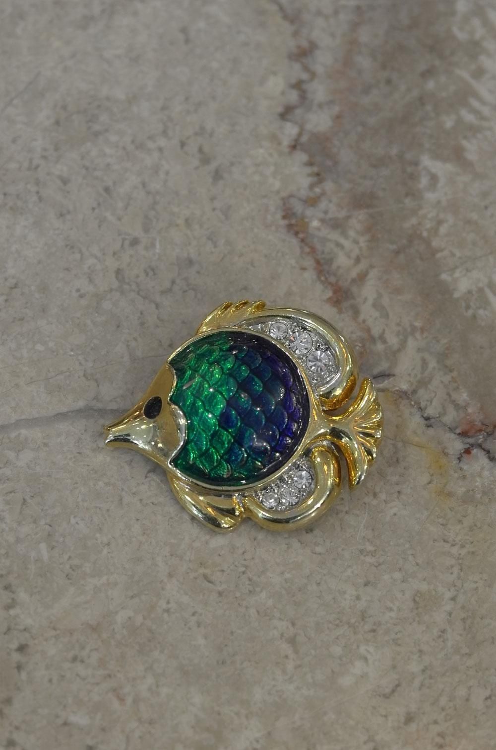 【フランスヴィンテージアクセサリーレディース】ブローチピンバッジ 熱帯魚 緑エナメル ラインストーン 金ゴールド 一点もの ファッション パリ