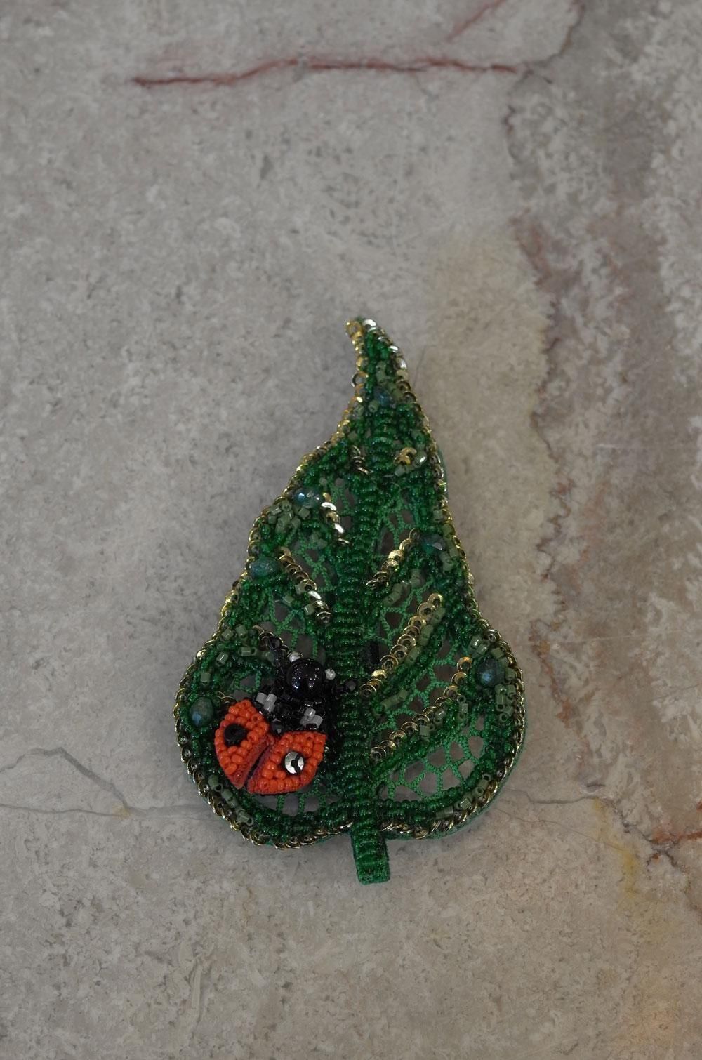 【フランス新品アクセサリーレディース】ブローチピンバッジ 葉とてんとう虫 ハンドメイド 赤緑ビーズ モダン ファッション ニューヨークデザイナー パリ