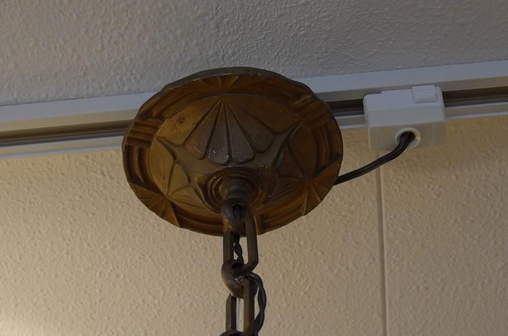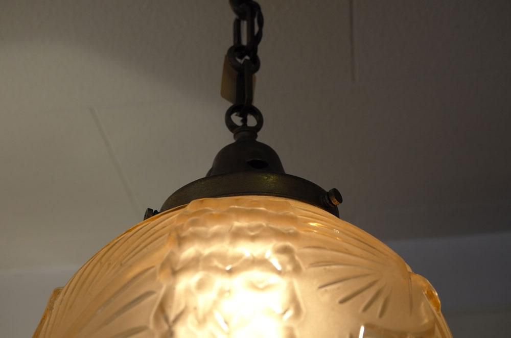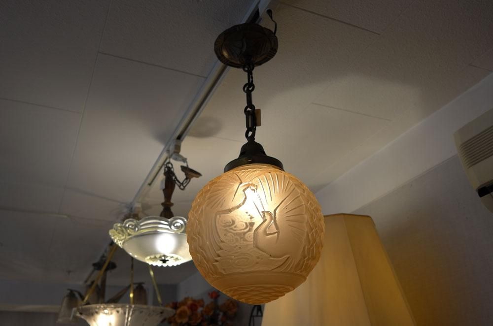 【フランスアンティーク照明アールデコ】Muller作 球形天井灯ランプシャンデリア ミューラー 孔雀鳥幾何学文様 ガラスシェード シーリング モダンインテリア パリ