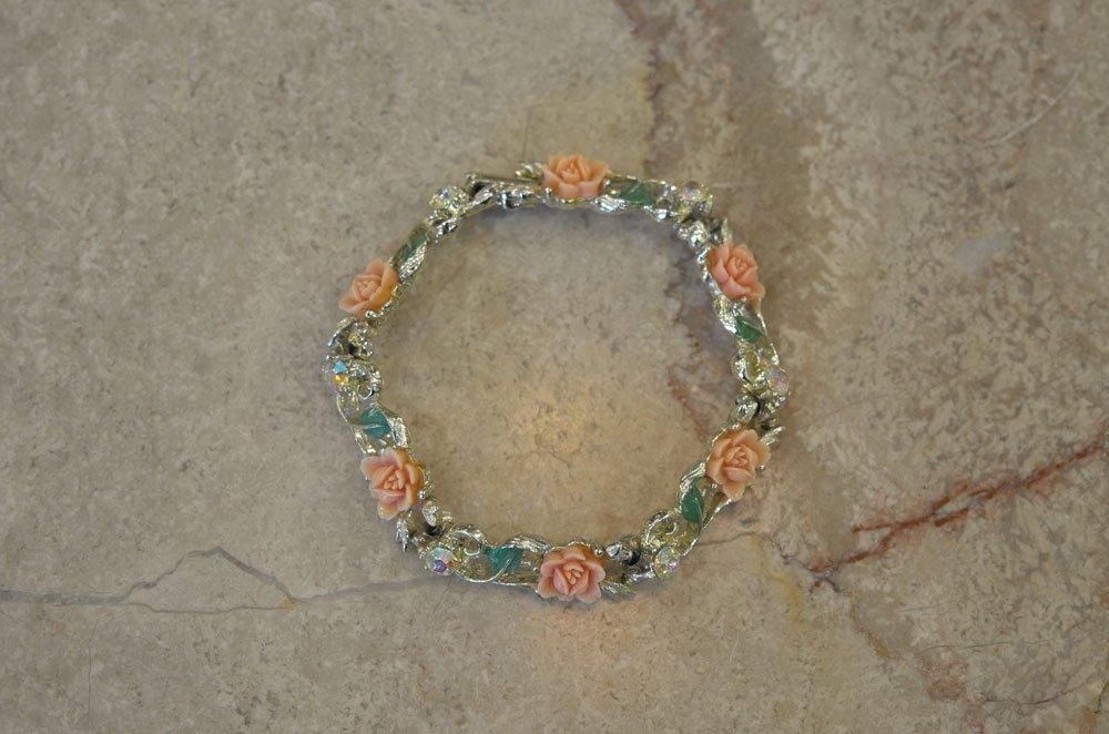 【フランスヴィンテージアクセサリーレディース】ブレスレット バングル 薔薇バラ ピンク樹脂 金ゴールド 一点もの パリ