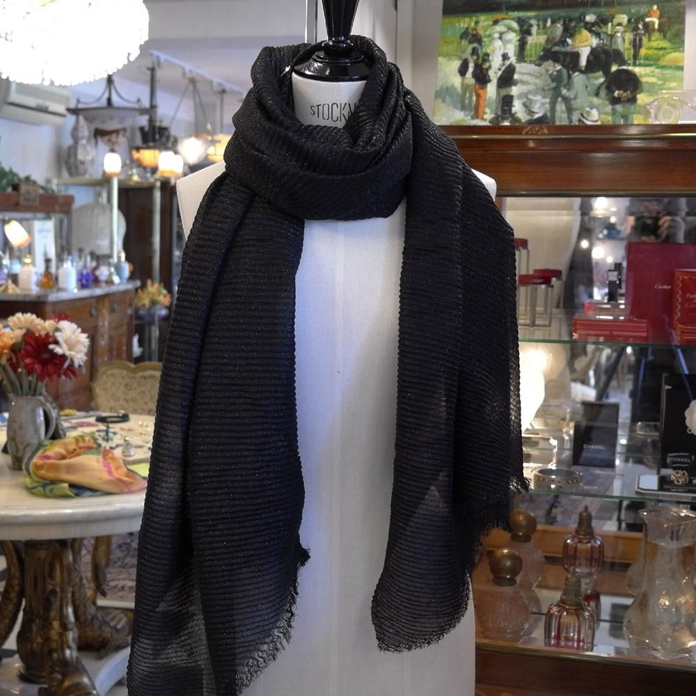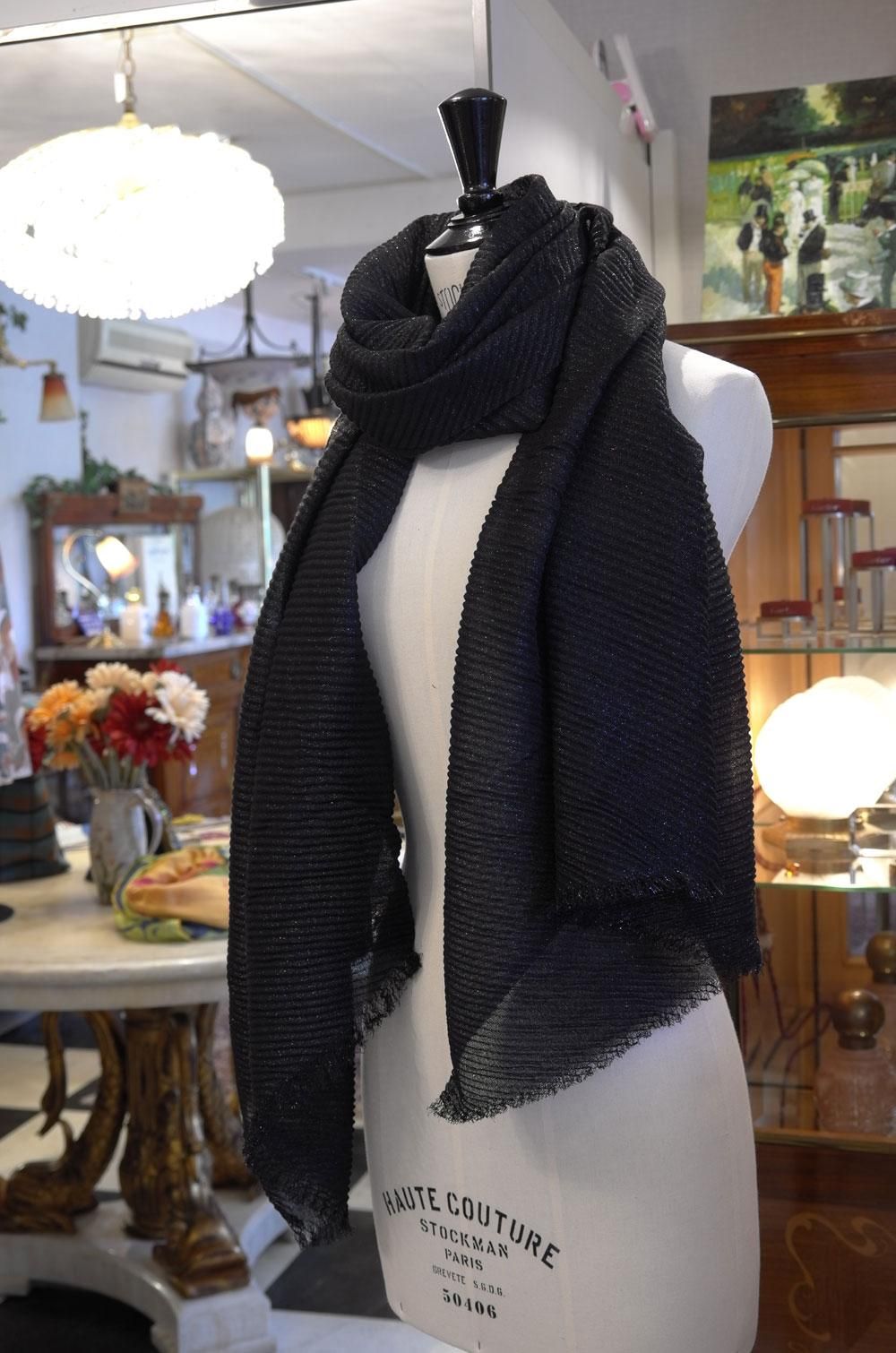 【フランス新品ファッション雑貨レディース】ストール マフラー 大判長方形 プリ―ツ加工 黒ラメ モダン パリ