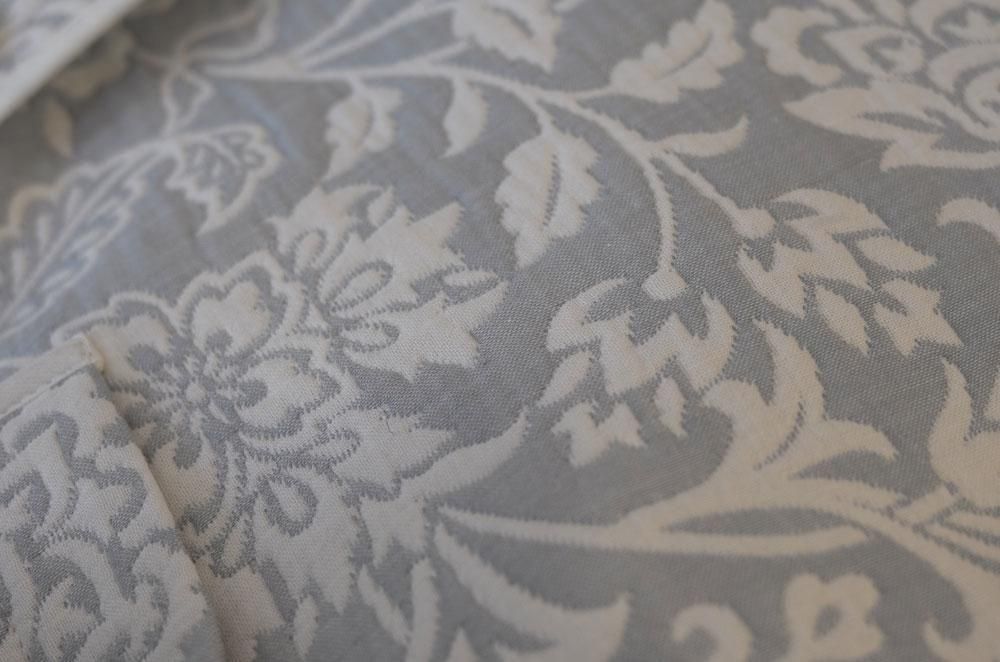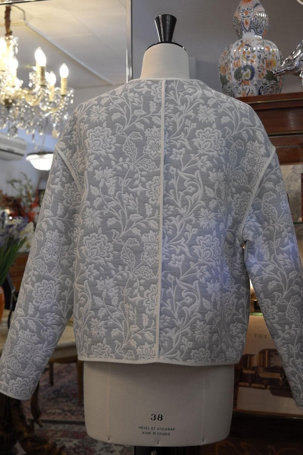 【フランス新品ファッションレディース】長袖ジャケットブルゾンアウター羽織 超軽量キルト ノーカラーV首 花フラワー刺繍 ブルー白 パッチポケット モダン パリ
