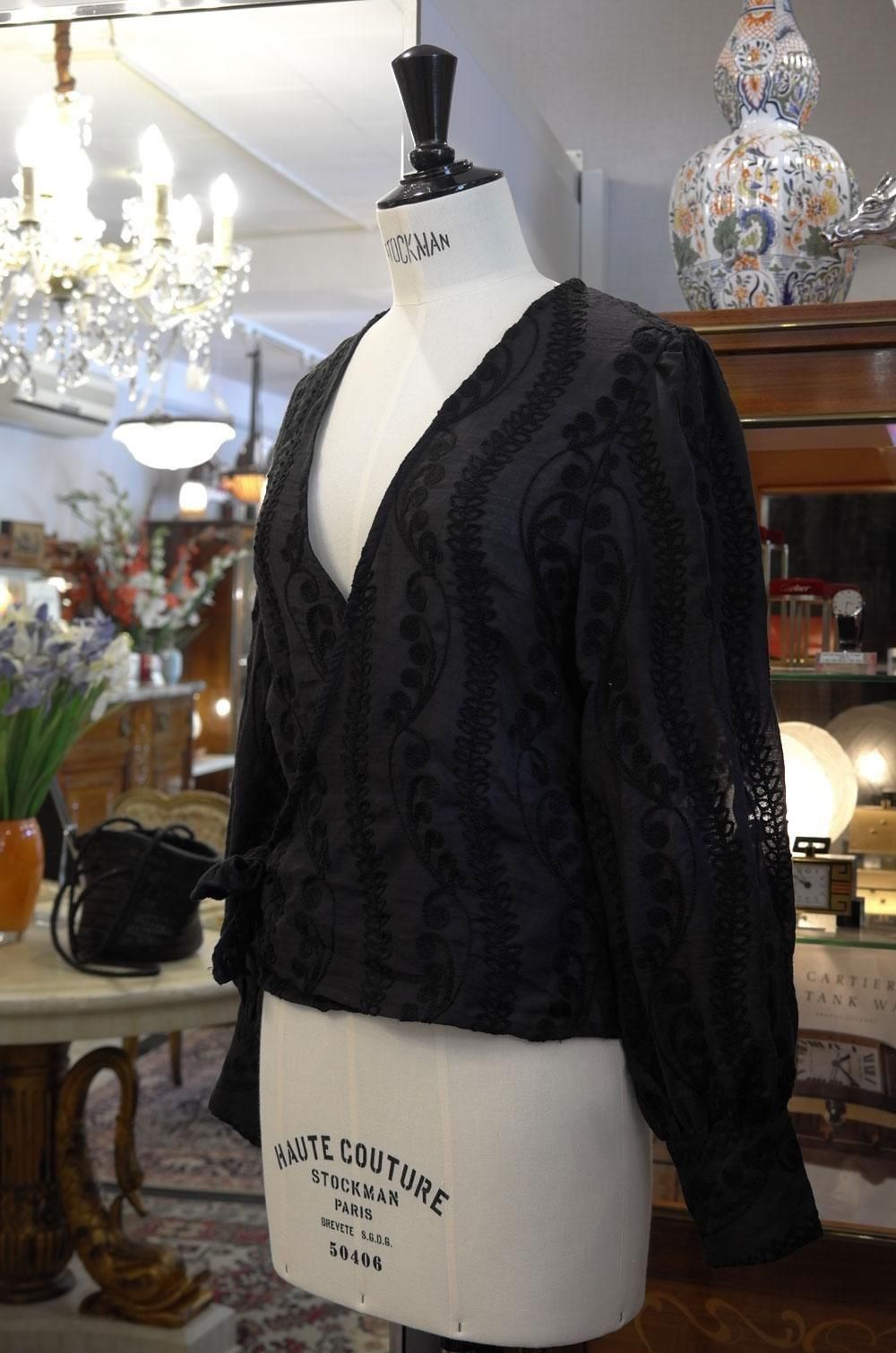 【フランス新品ファッションレディース】長袖トップスカシュクール羽織 植物刺繍 透け 黒 モダン パリ
