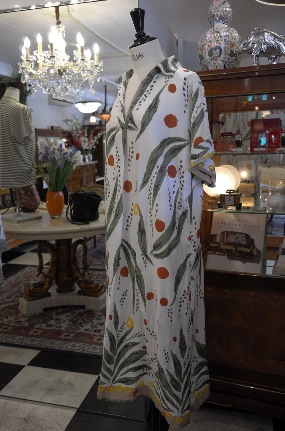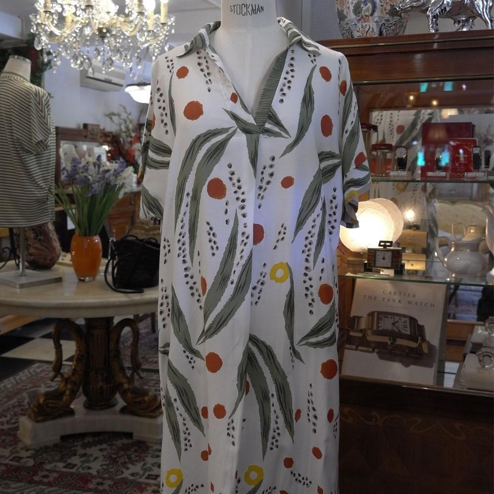 【フランス新品ファッションレディース】ロングワンピース半袖 植物プリント柄 白カーキ赤 モダン パリ