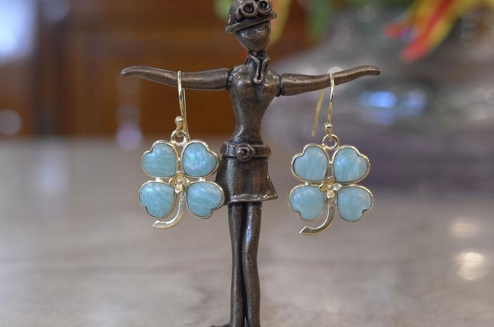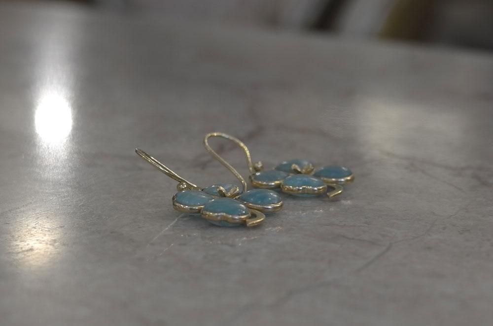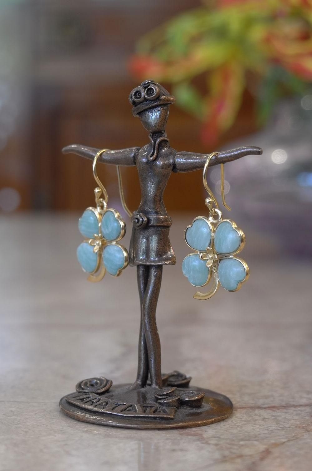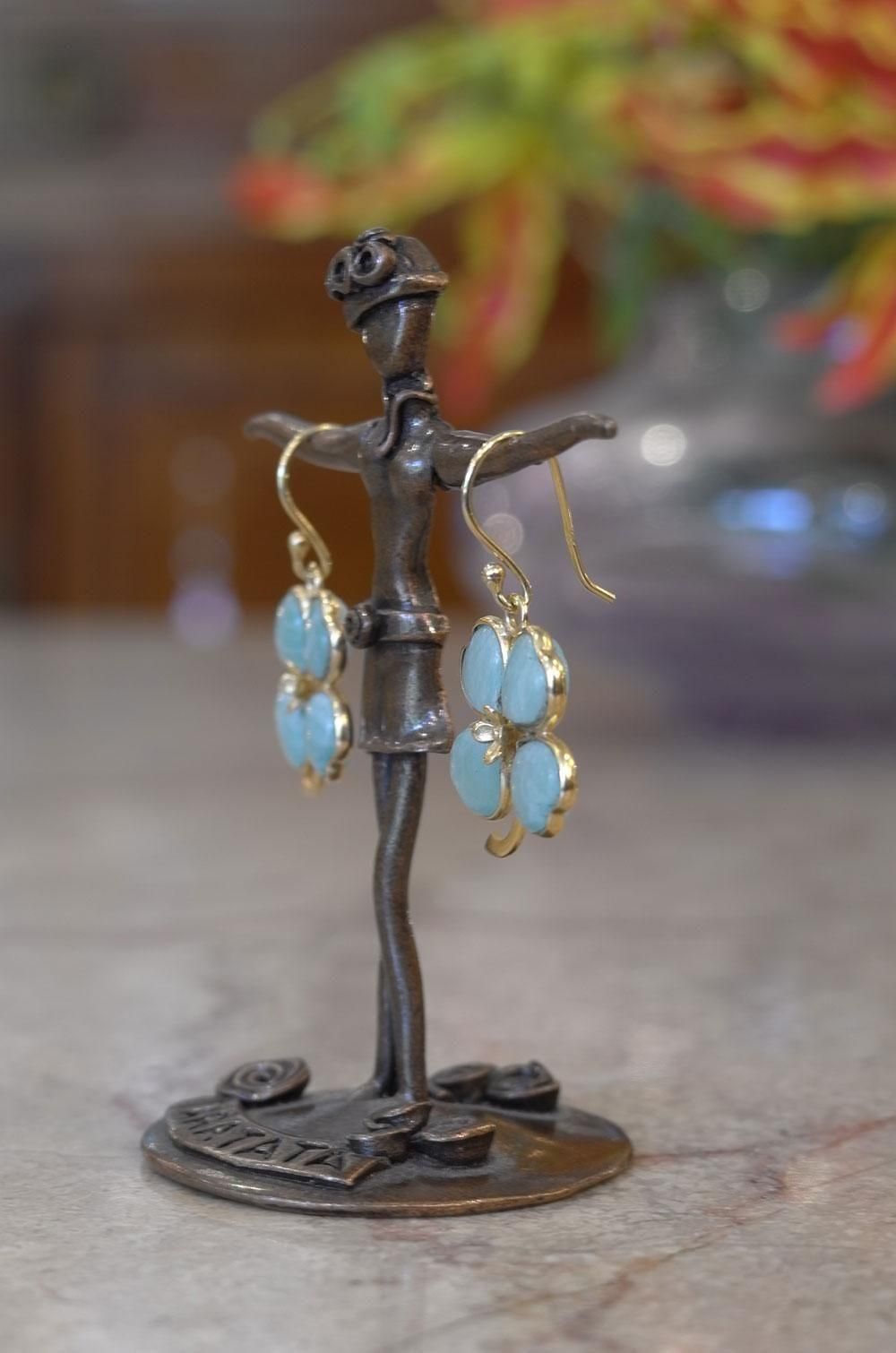 【フランス新品アクセサリーレディース】ピアス 四つ葉クローバー 水色天然石 銀シルバー 金ヴェルメイユ フランス作家 スウィング モダン ファッション パリ
