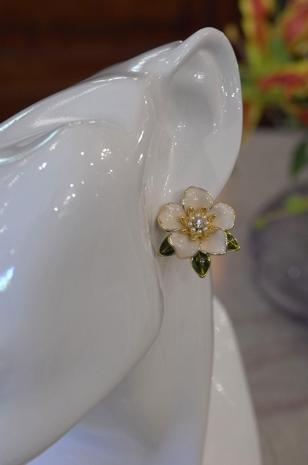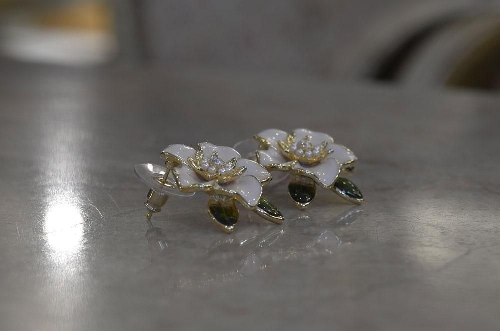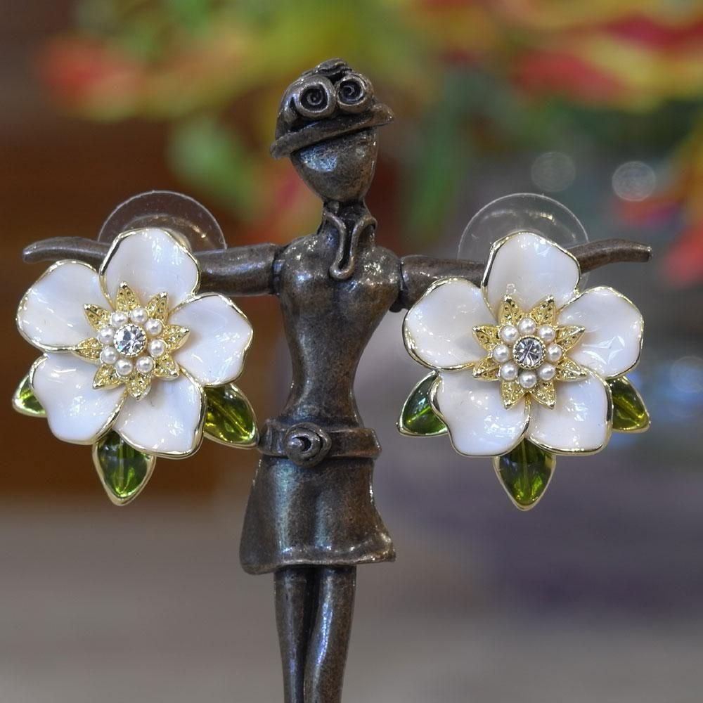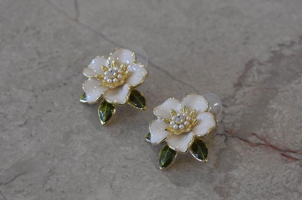 【フランス新品アクセサリーレディース】ピアス 白花フラワー 金緑 パール スタッド ファッション パリ