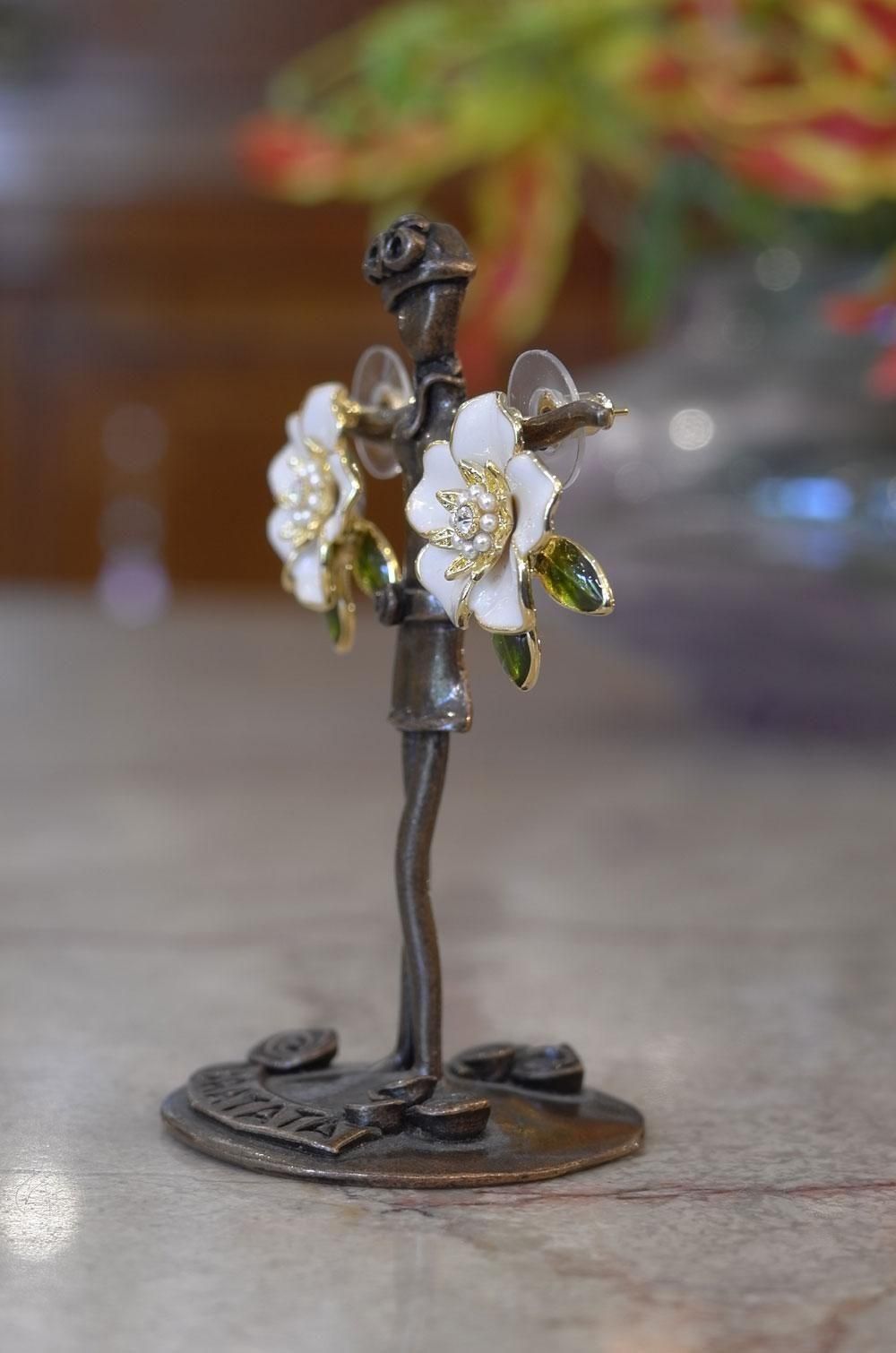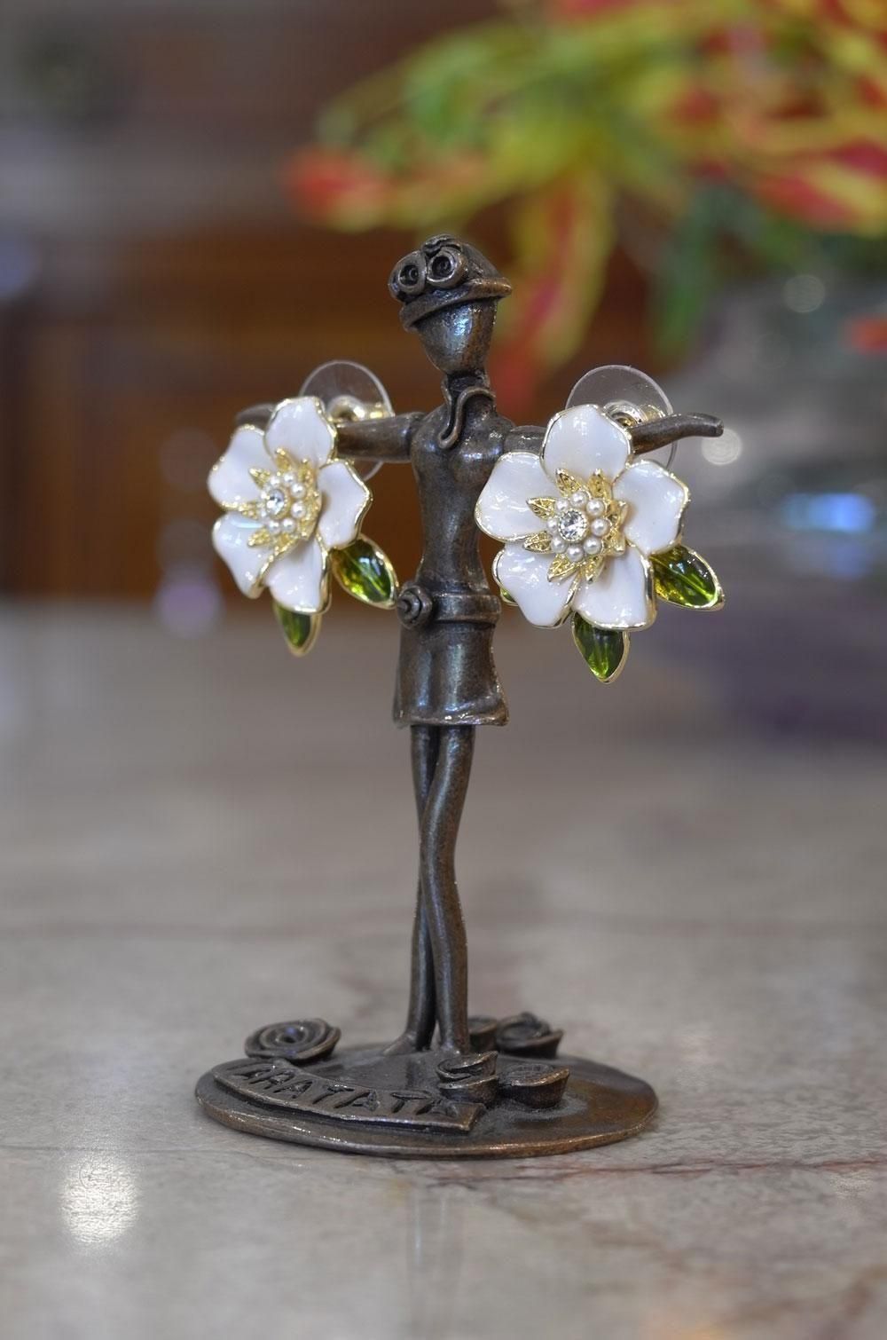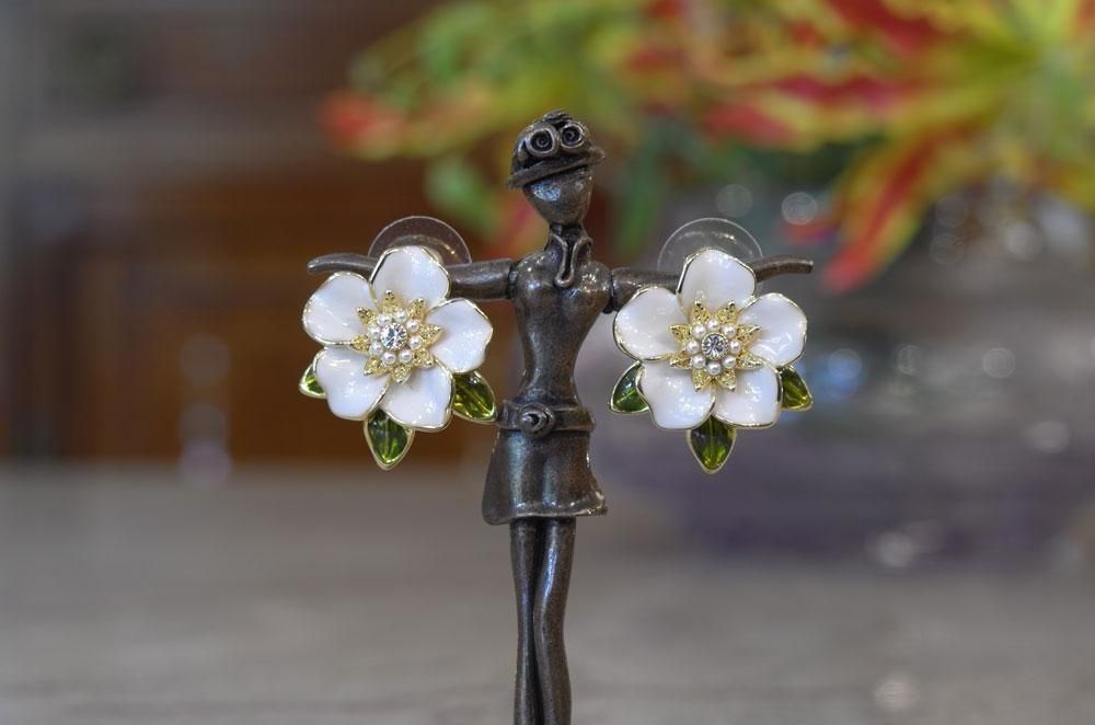 【フランス新品アクセサリーレディース】ピアス 白花フラワー 金緑 パール スタッド ファッション パリ