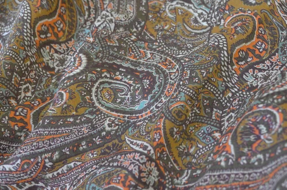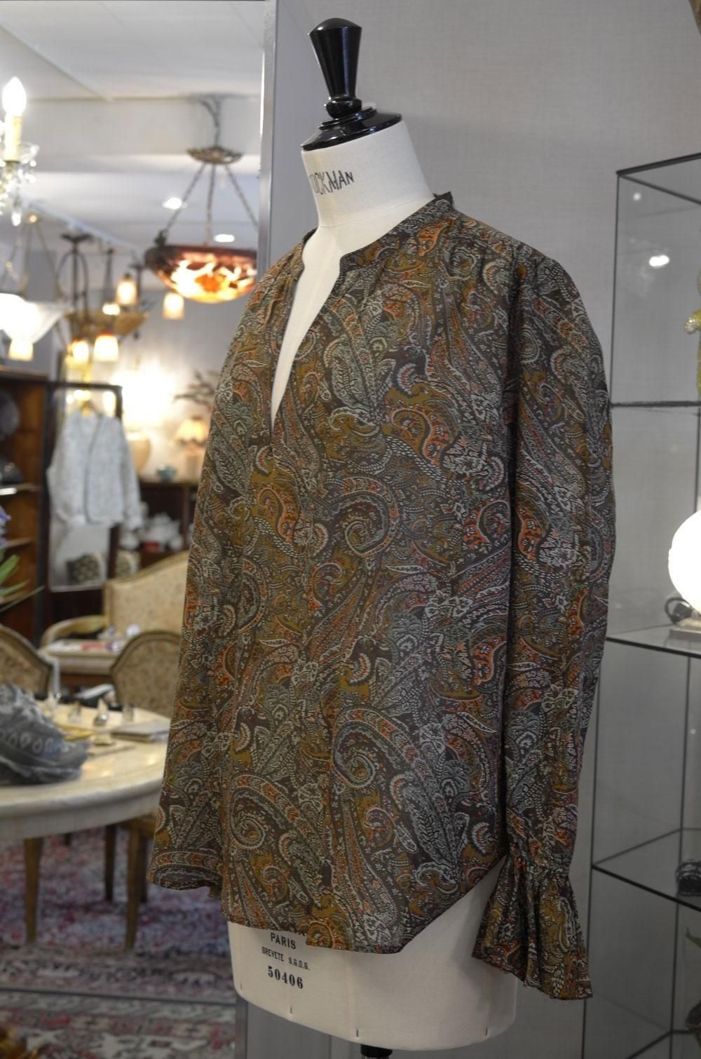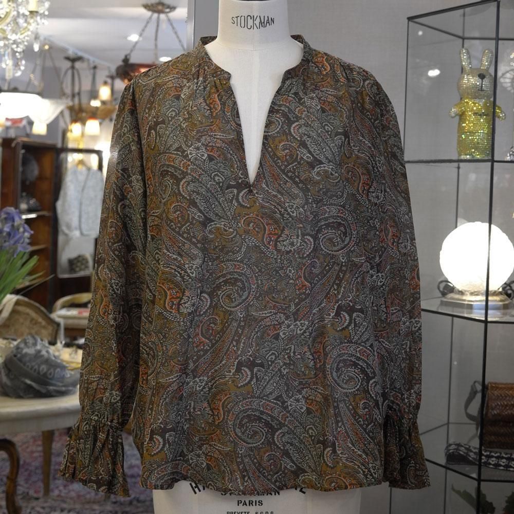 【フランス新品ファッションレディース】長袖ブラウスシャツトップス スリットネック 薄手 ペイズリー柄 茶オレンジ緑 モダン パリ