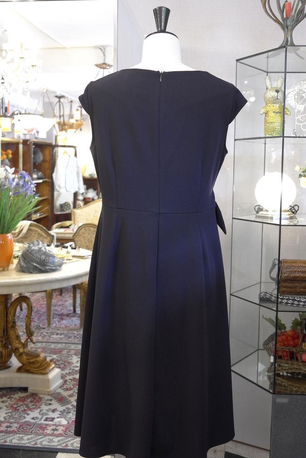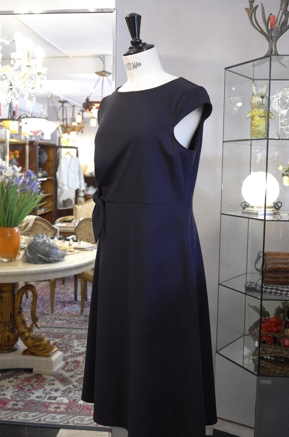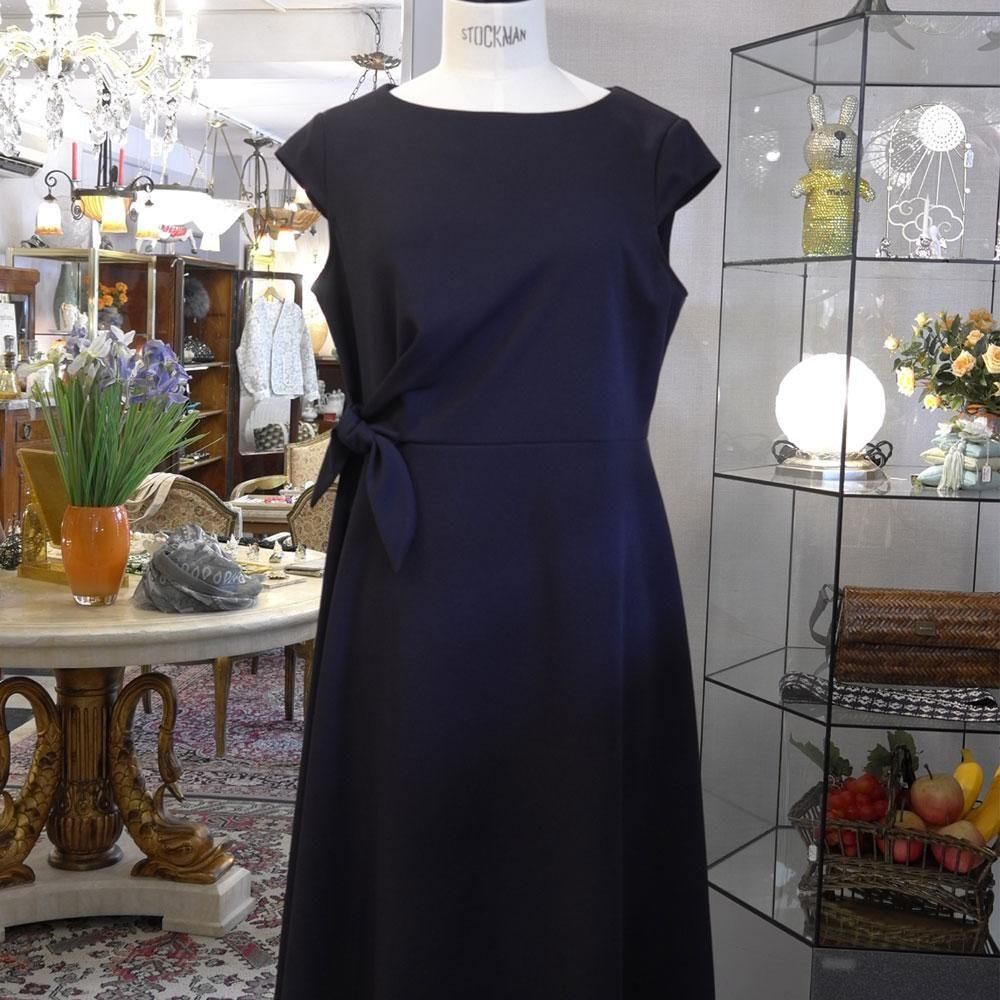【フランス新品ファッションレディース】半袖ワンピース オブロングネック ウエストリボン フレンチスリーブ 上質紺 モダン パリ