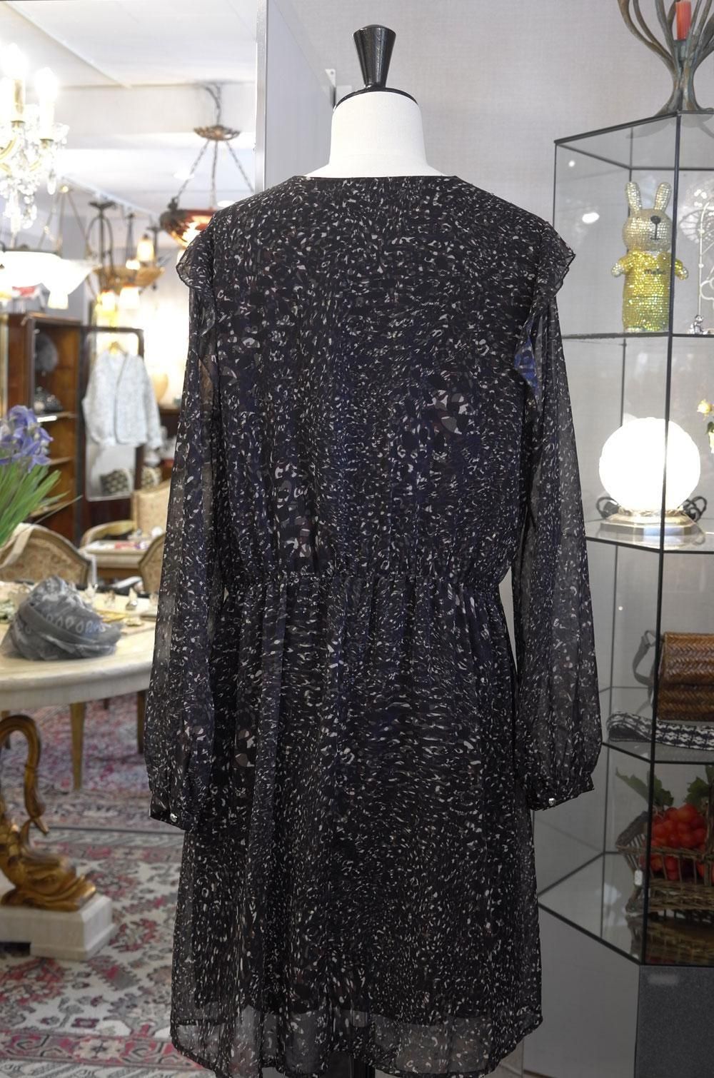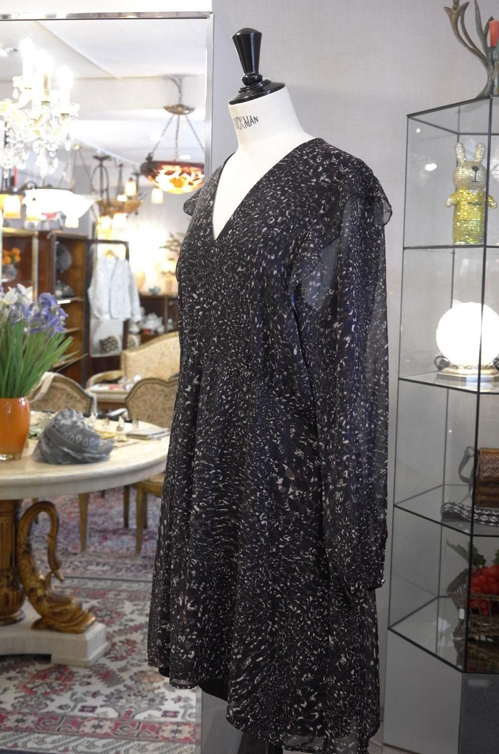 【フランス新品ファッションレディース】長袖ワンピースチュニック 脇ひらひら Vネック 紺茶白モダン柄ラメ モード パリ