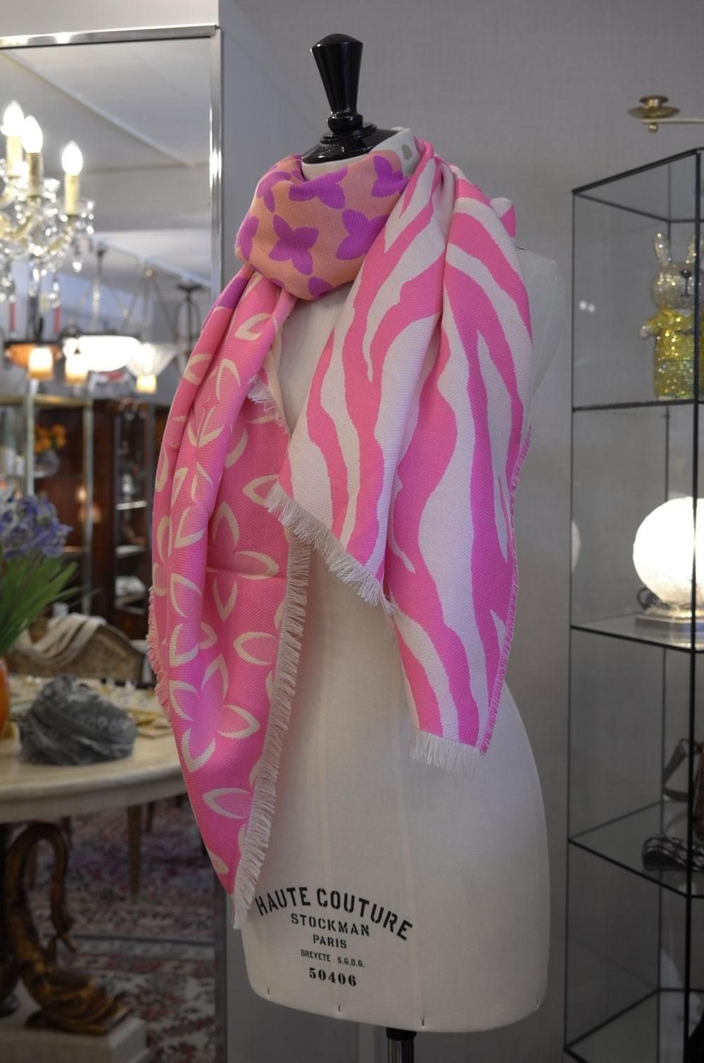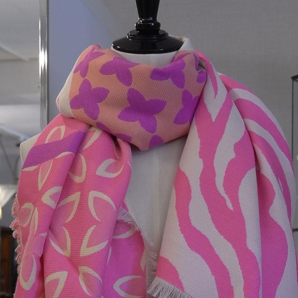【フランス新品ファッション雑貨レディース】マフラー ストール フリンジ ゼブラ豹モノグラムミックス模様 厚手ピンク紫ベージュ モダン パリ