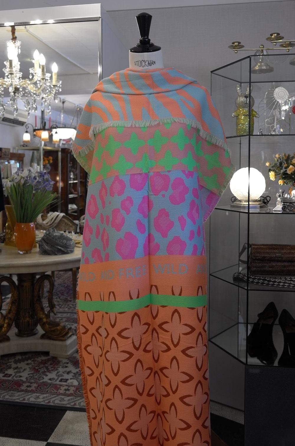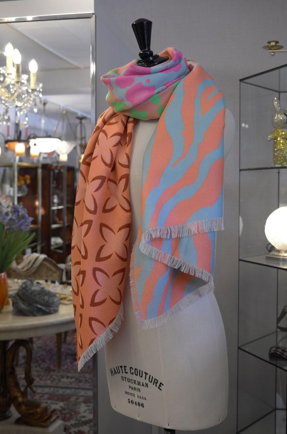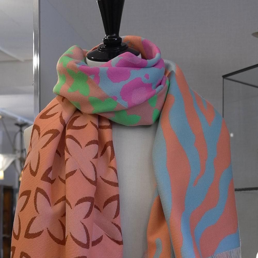 【フランス新品ファッション雑貨レディース】マフラー ストール フリンジ ゼブラ豹モノグラムミックス模様 厚手オレンジ水色緑 モダン パリ