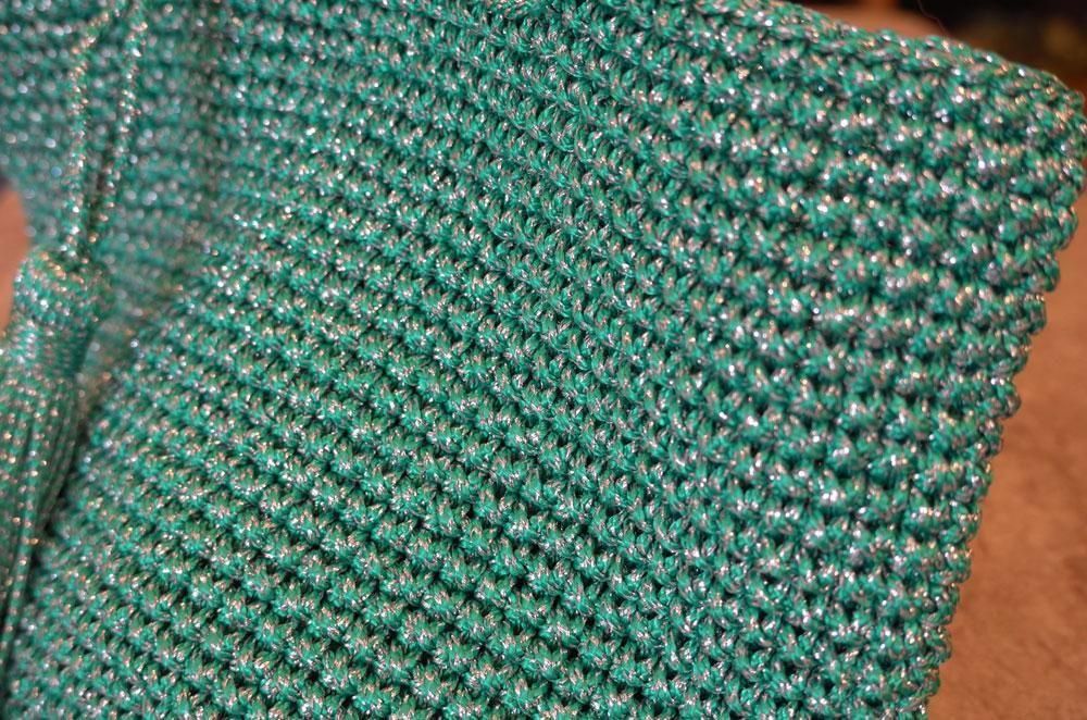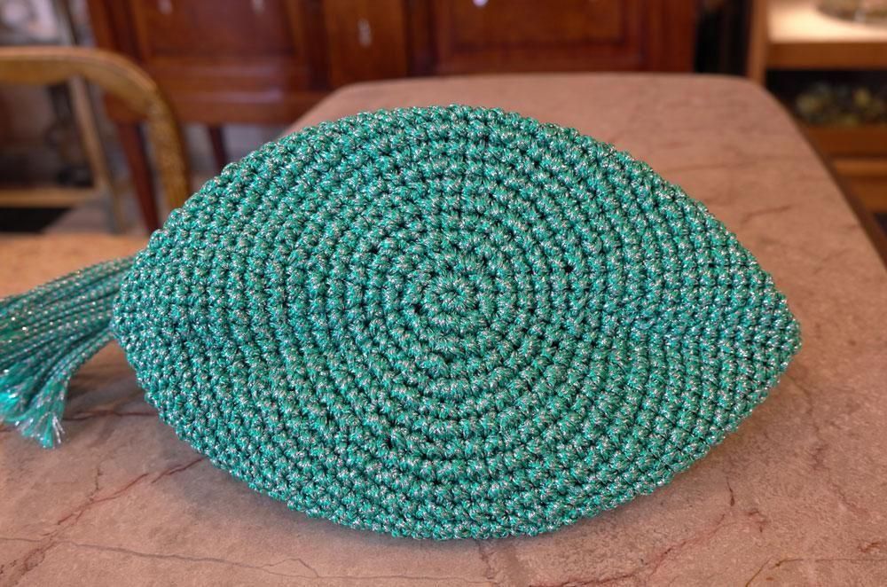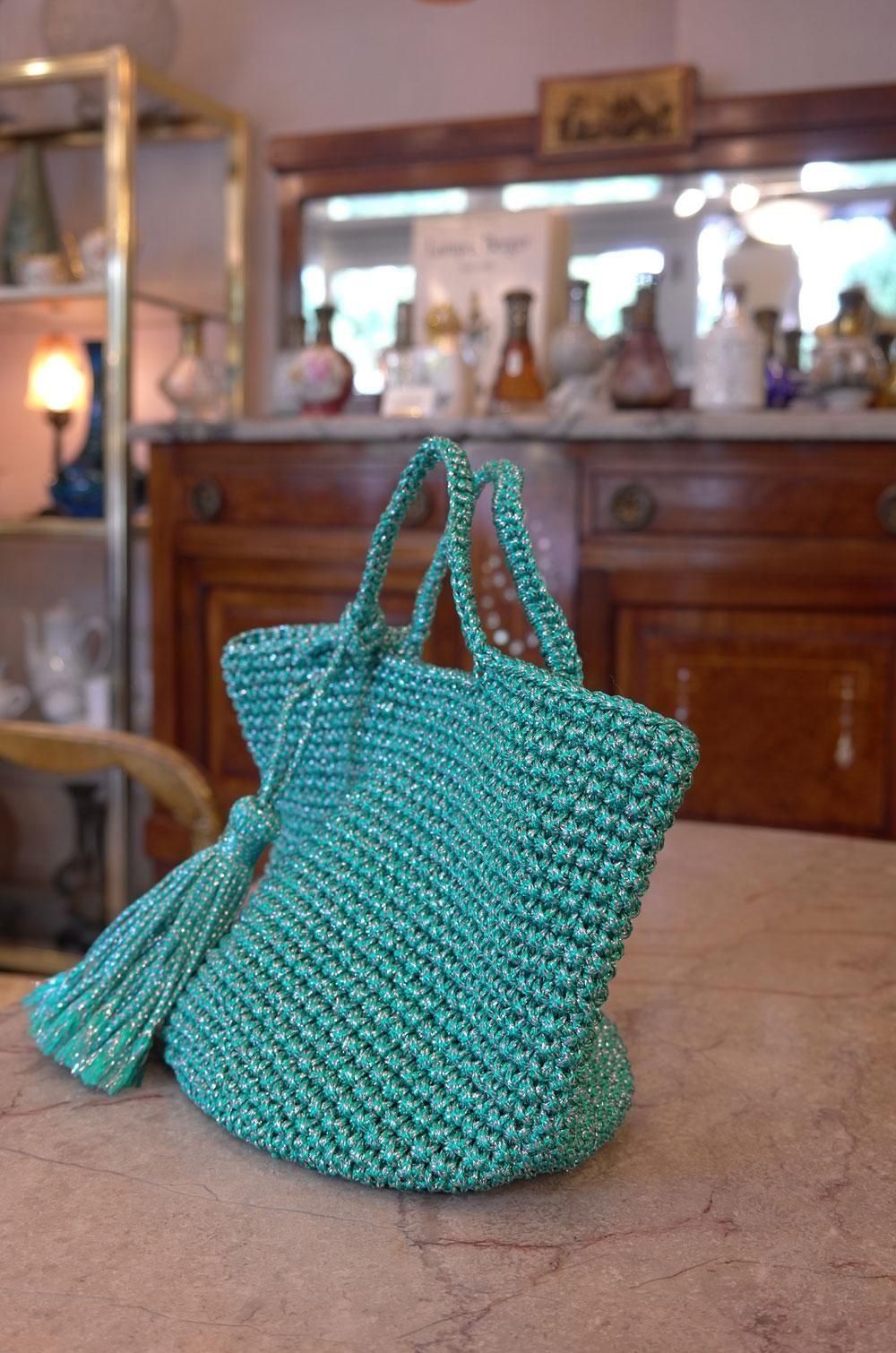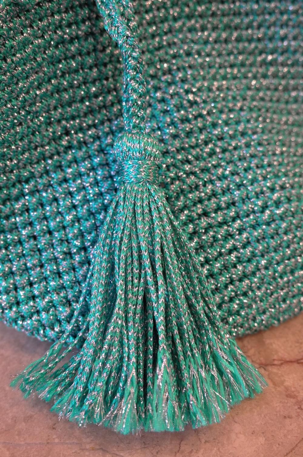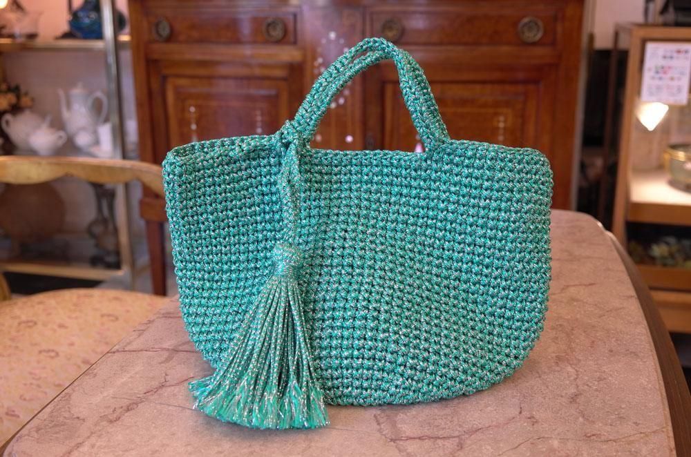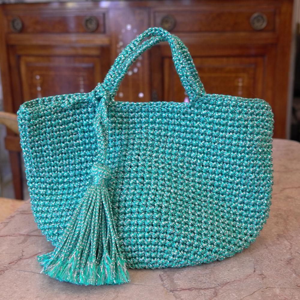 【フランス新品ファッション雑貨レディース】ミニトートバック 手編み タッセル 緑銀 モロッコ作家 モダン パリ