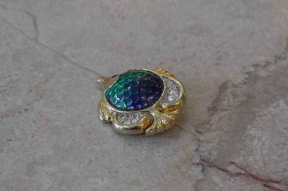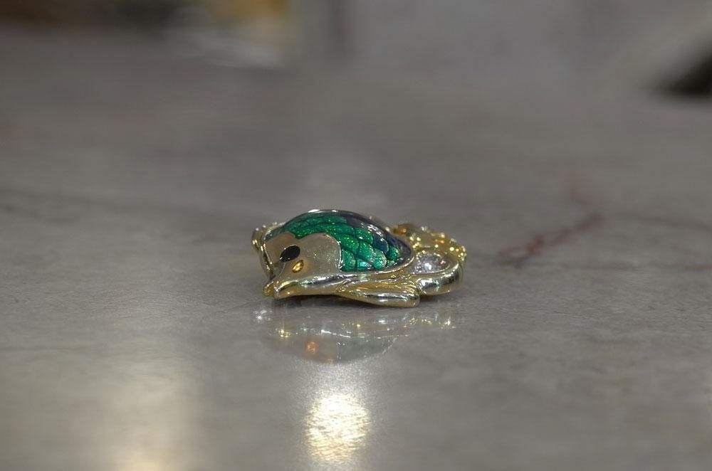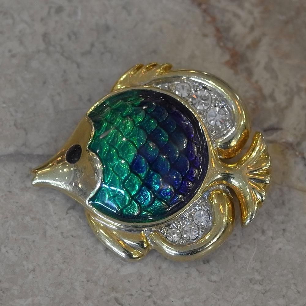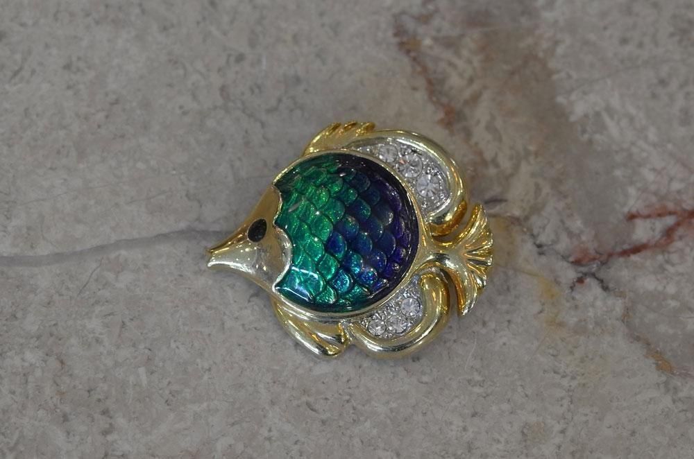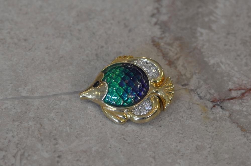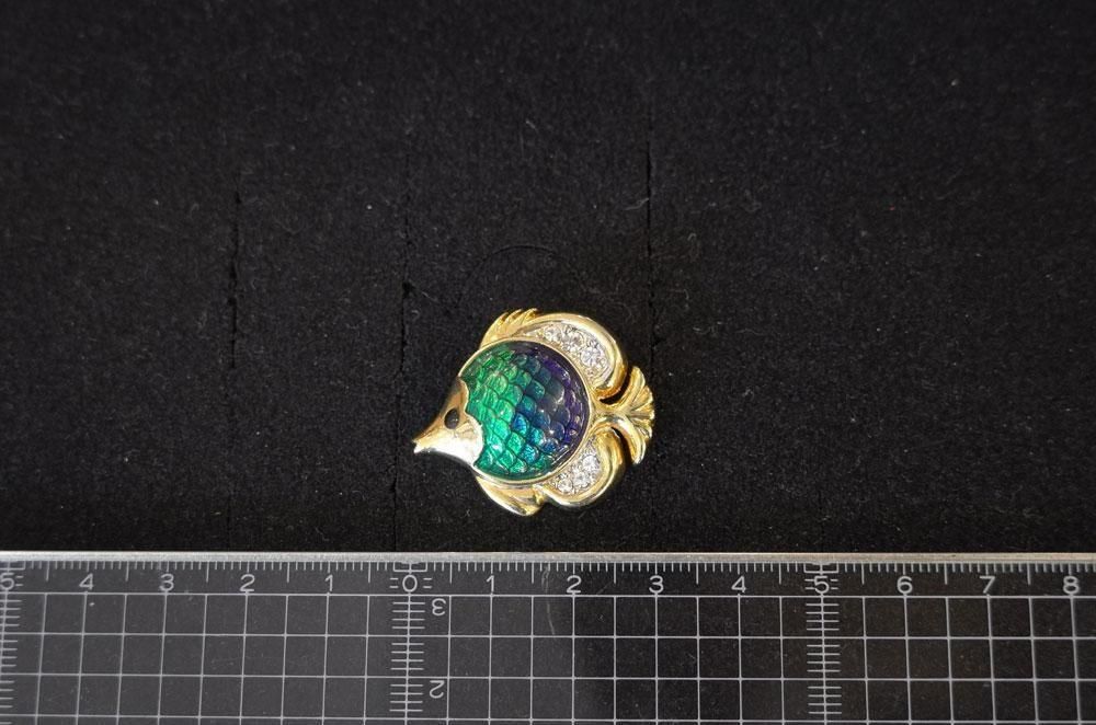 【フランスヴィンテージアクセサリーレディース】ブローチピンバッジ 熱帯魚 緑エナメル ラインストーン 金ゴールド 一点もの ファッション パリ
