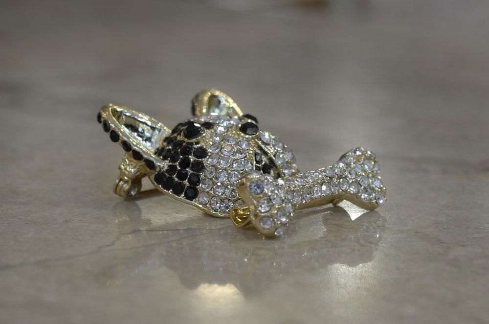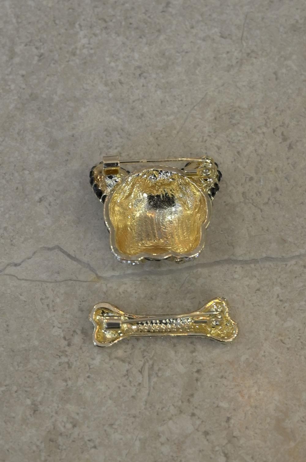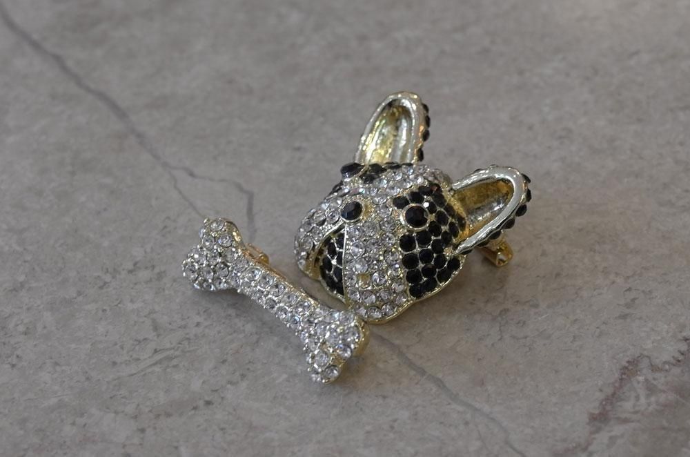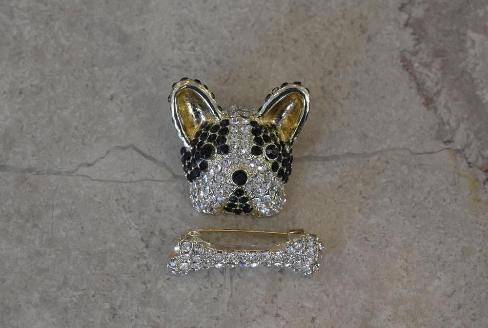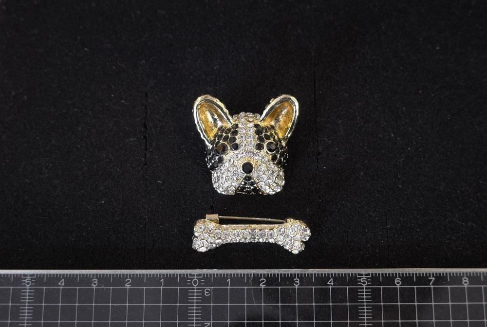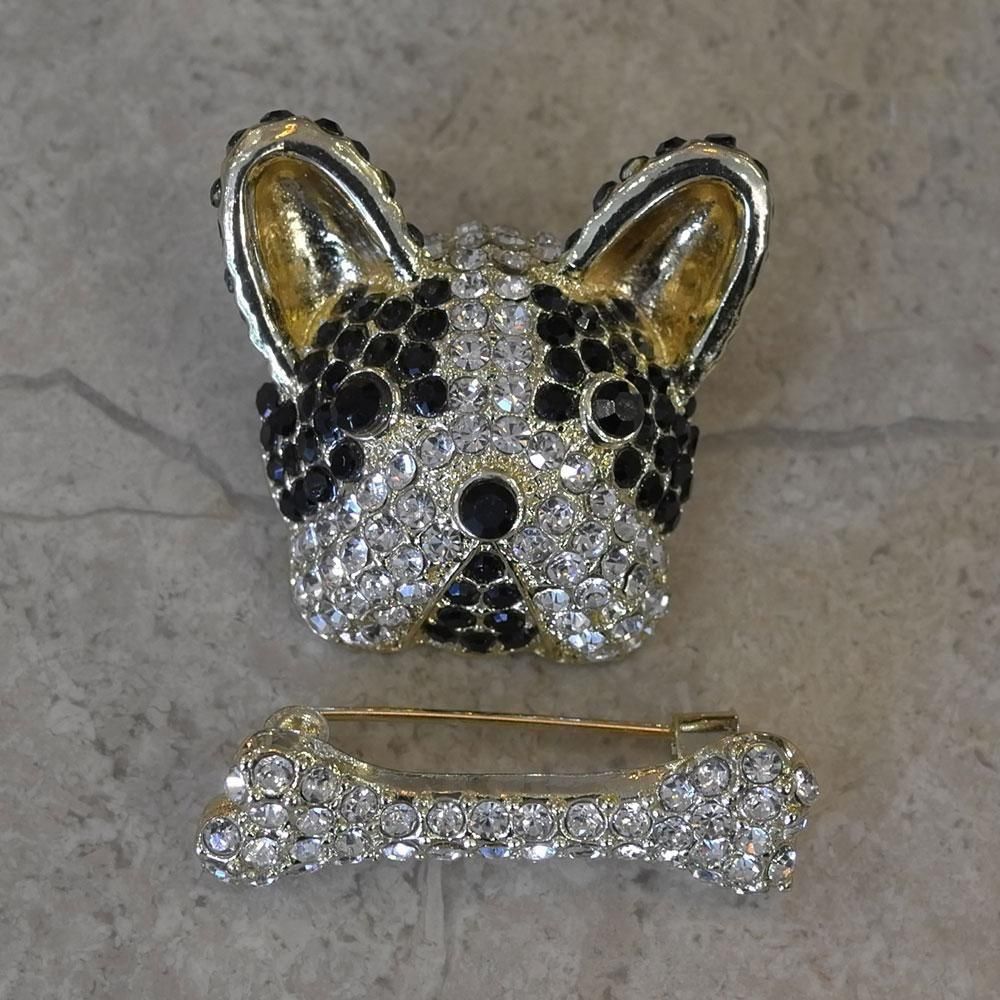 【フランス新品アクセサリーレディース】ブローチピンバッジ フレンチブルドックと骨 ラインストーン キラキラ モダン ファッション パリ
