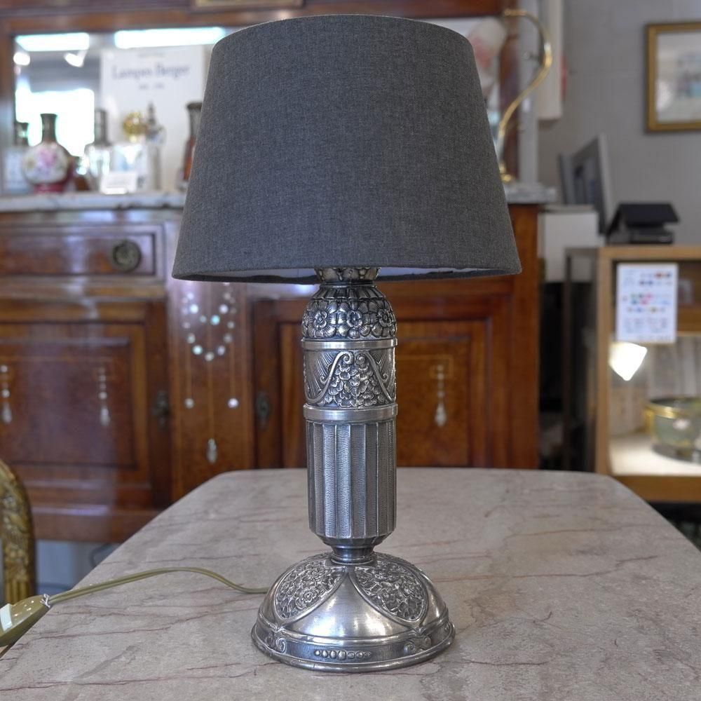 【フランスアンティーク照明アールデコ】 テーブルランプ 花文様ロカイユ装飾ベース 黒傘布シェード 作家もの モダン インテリア パリ