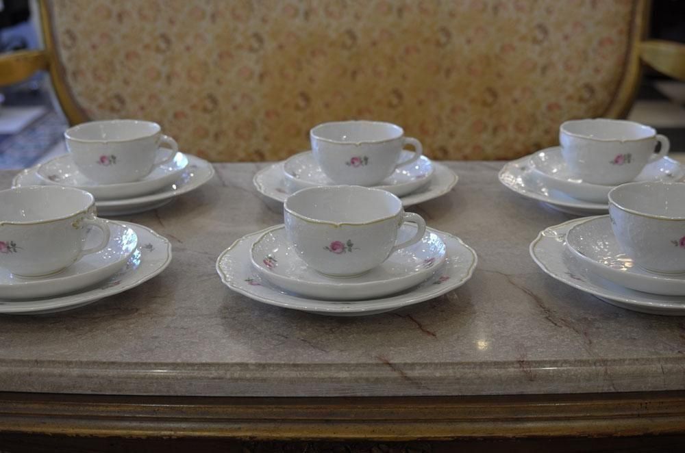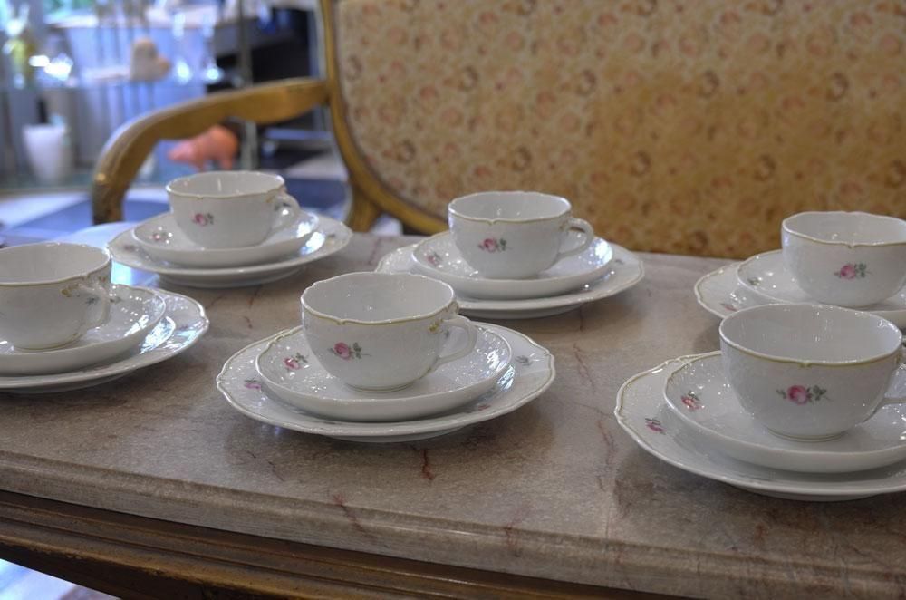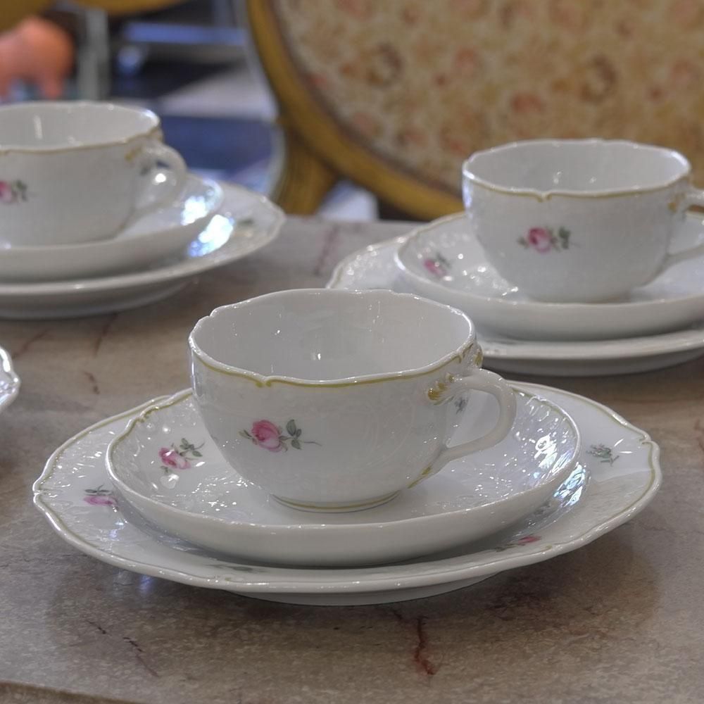 【ドイツヴィンテージ雑貨】MEISSEN マイセンローズ 18点セット カップ&ソーサ―食器 トリオ 金彩陶磁器 華麗なレリーフ インテリア